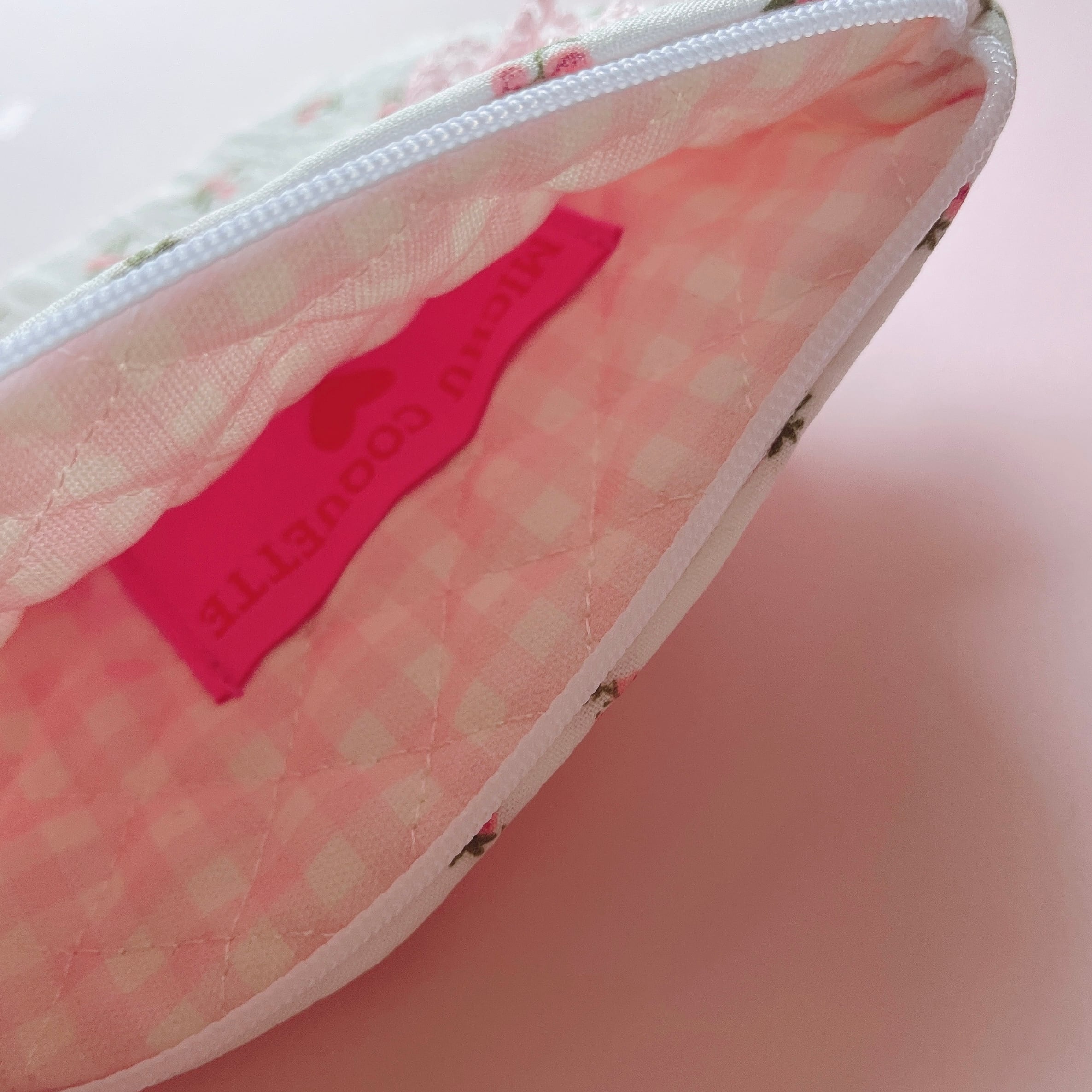 やわらかなコットンガーゼに小花柄をあしらったフラットポーチです。