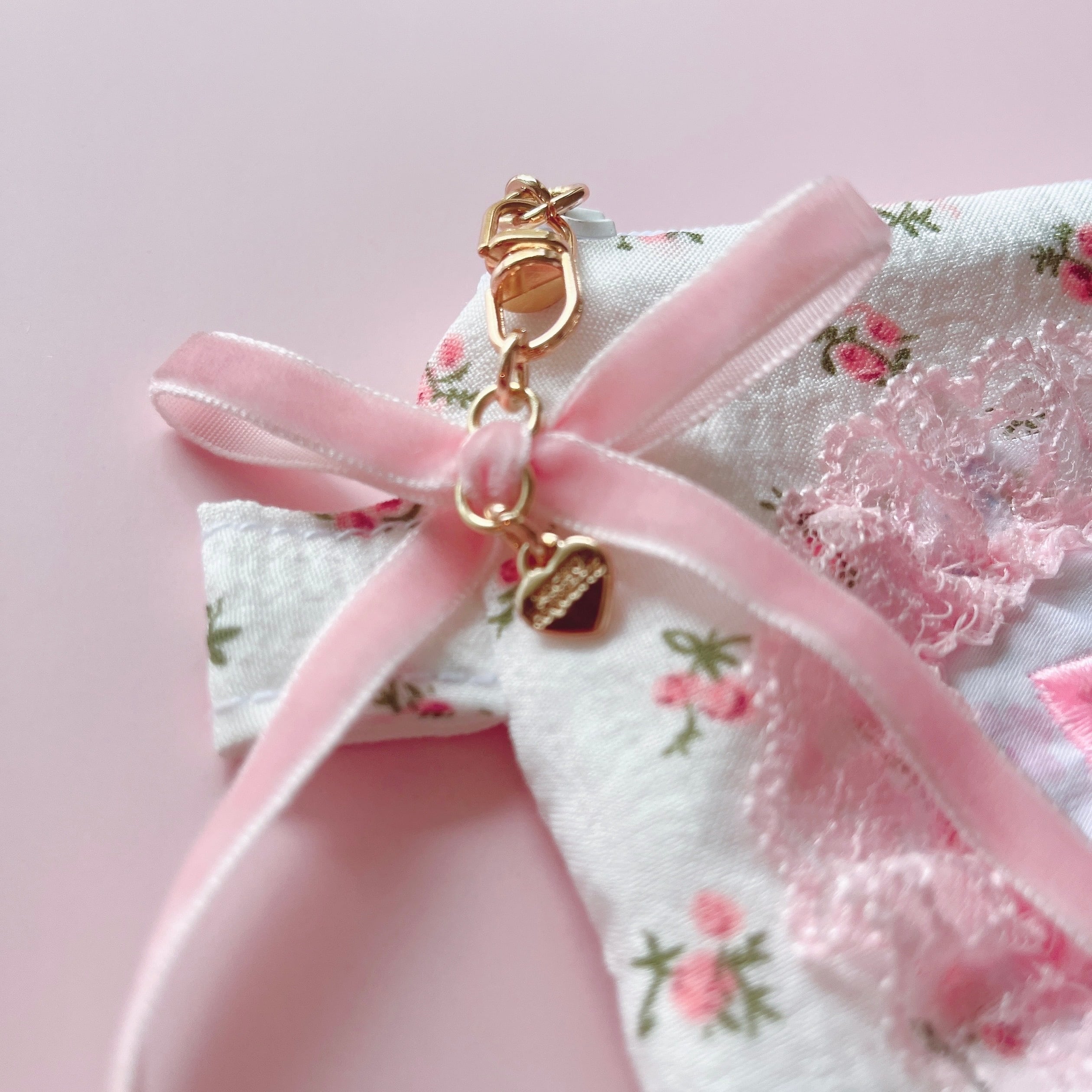 大きめのベルベットリボンとビーズで作ったチェリーもデザインのポイント。