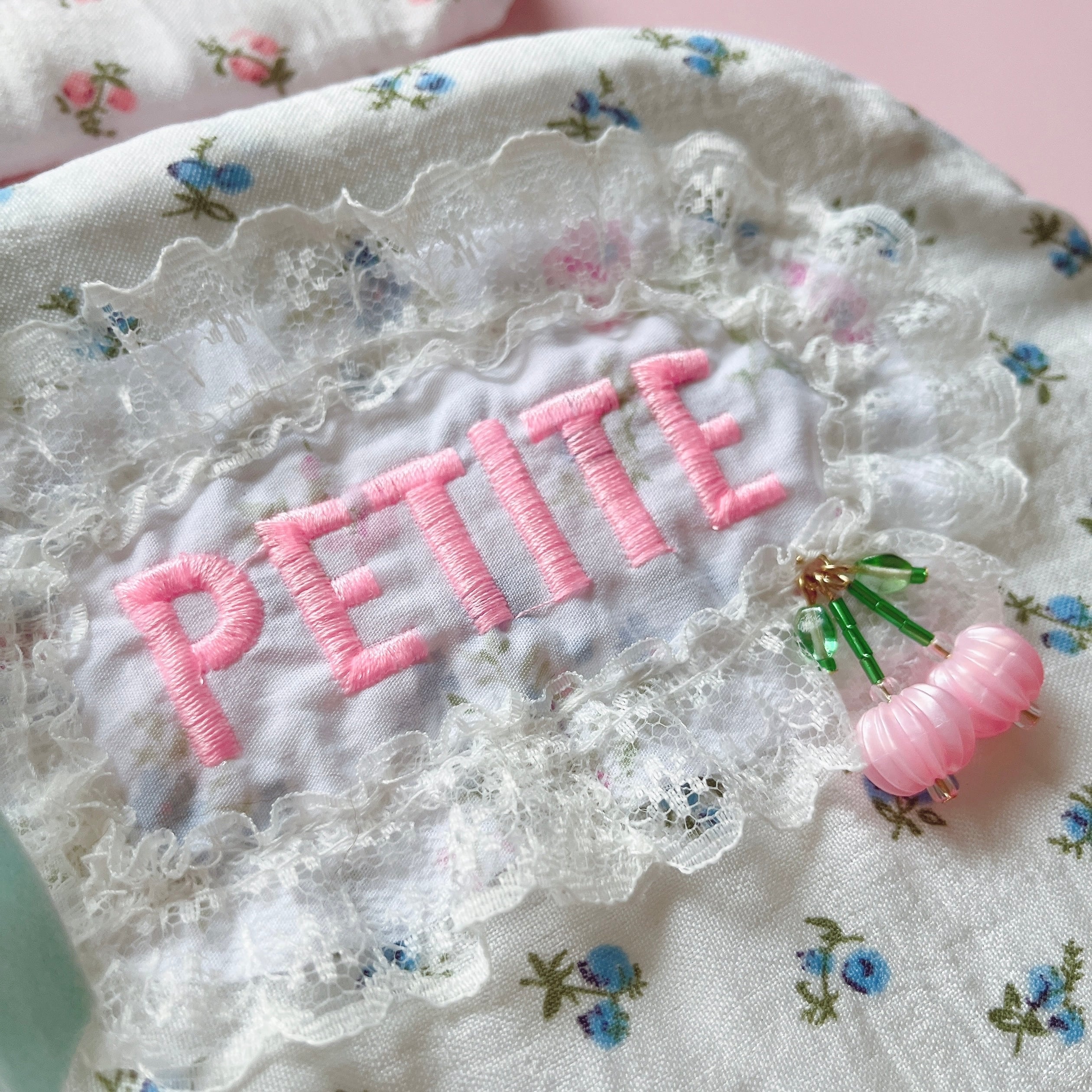 刺繍を施した生地を丸くカットし、レースのフリルを縫い合わせてアップリケ状に仕立て、