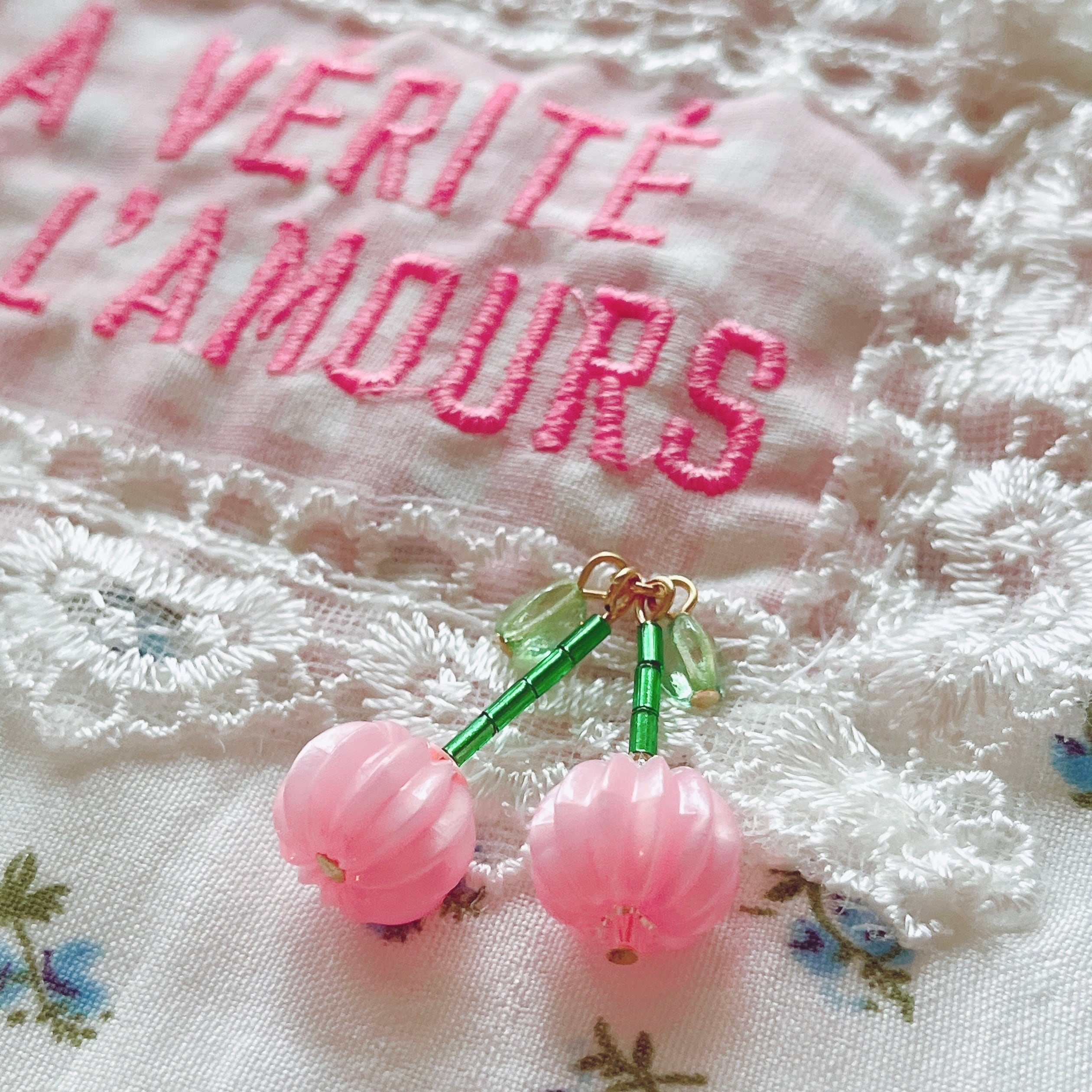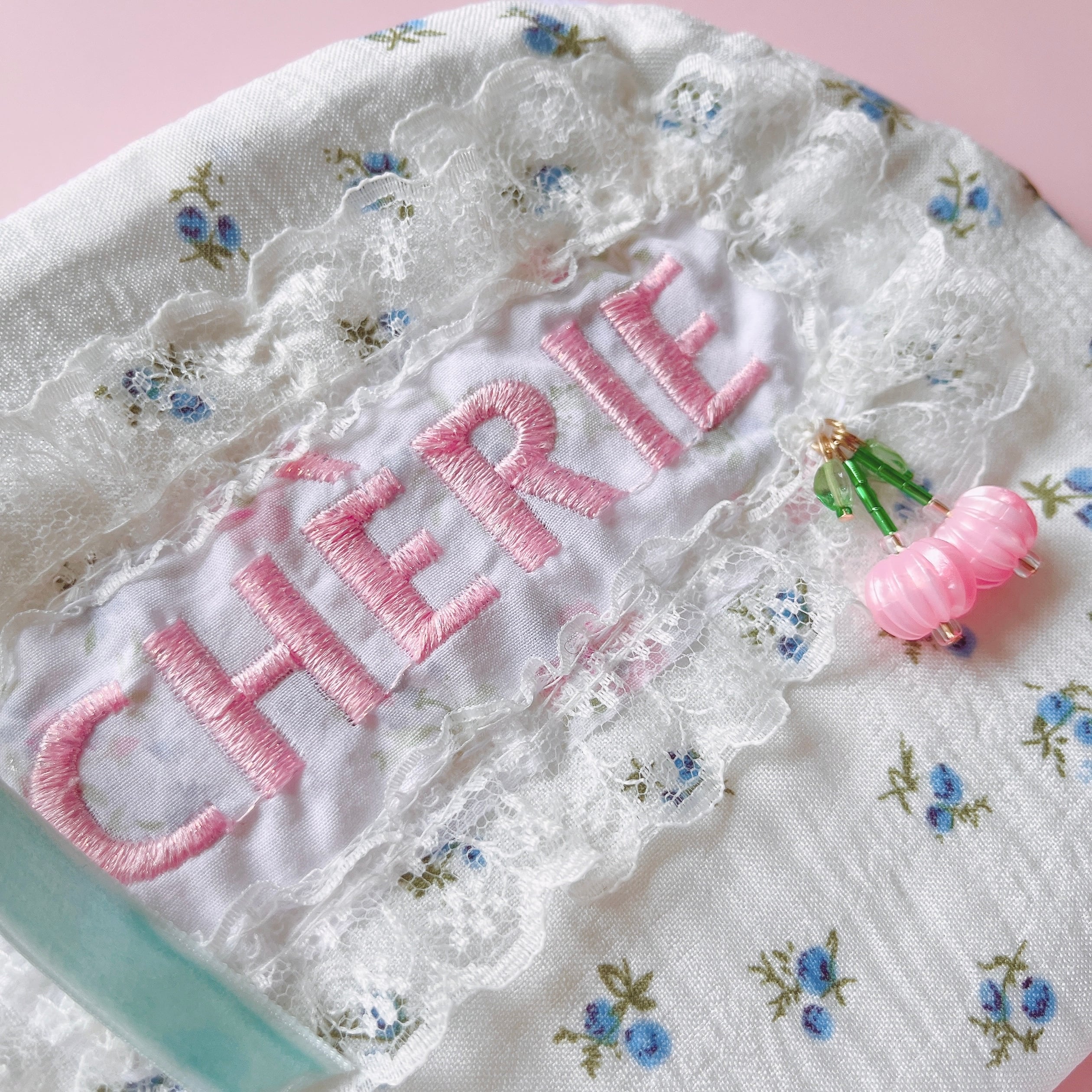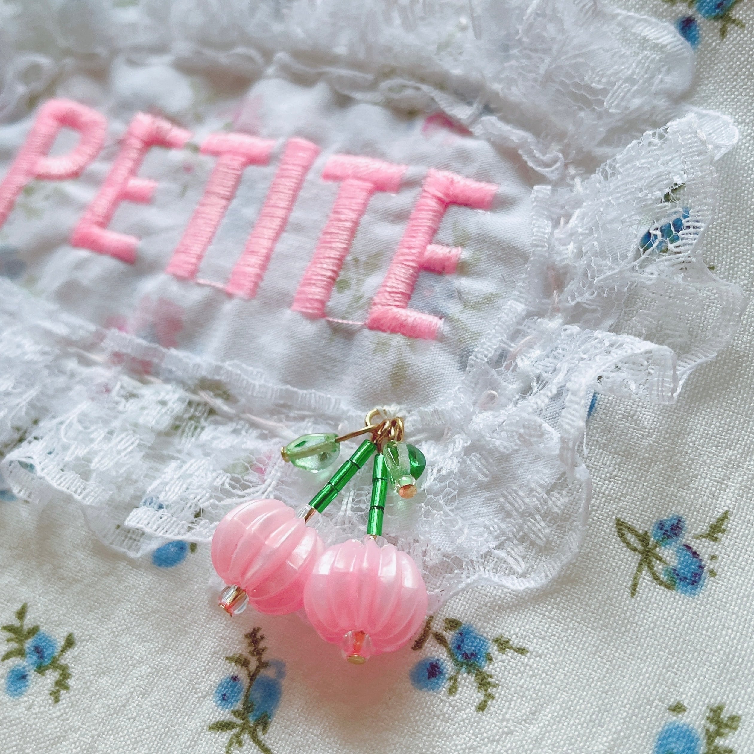 大きめのベルベットリボンとビーズで作ったチェリーもデザインのポイント。