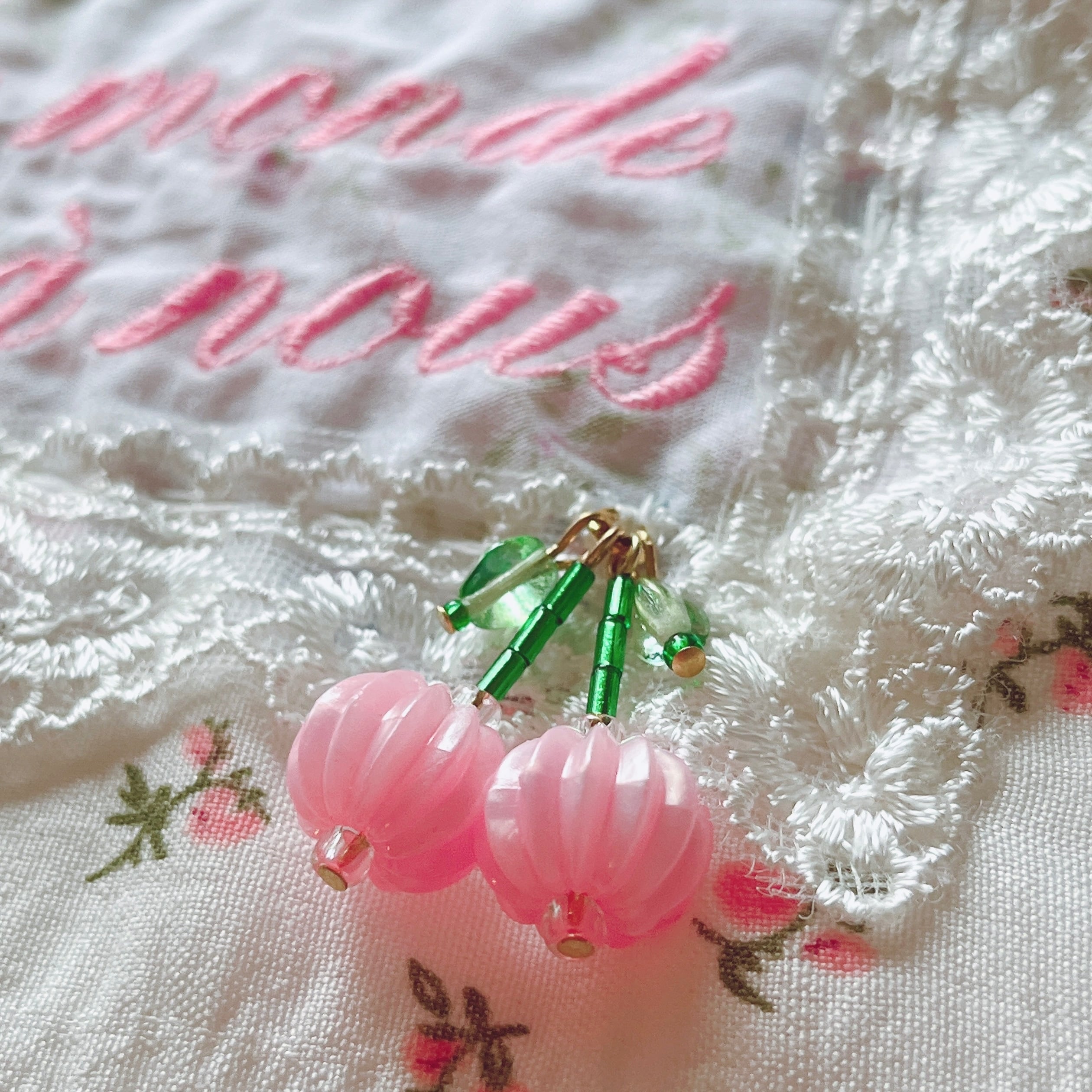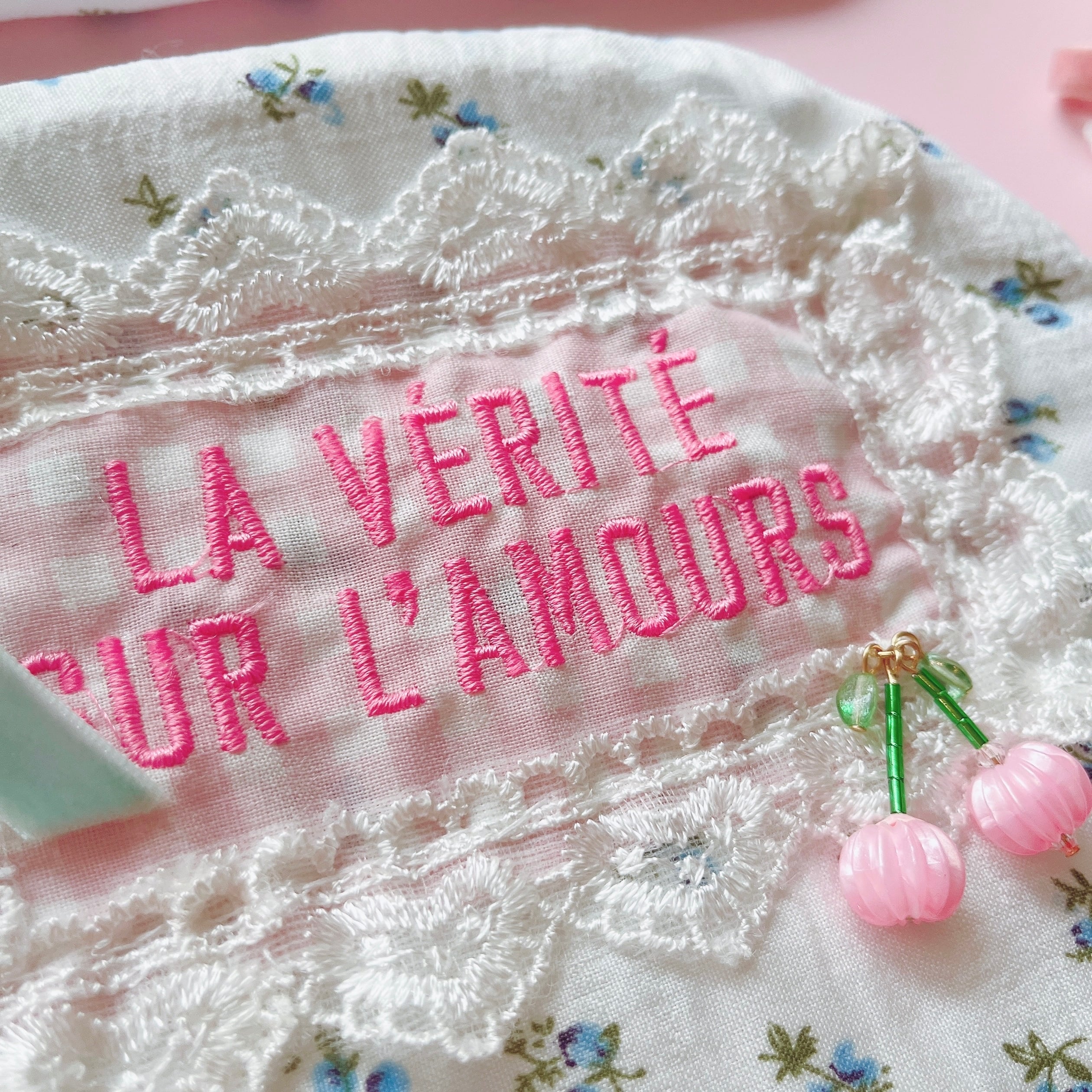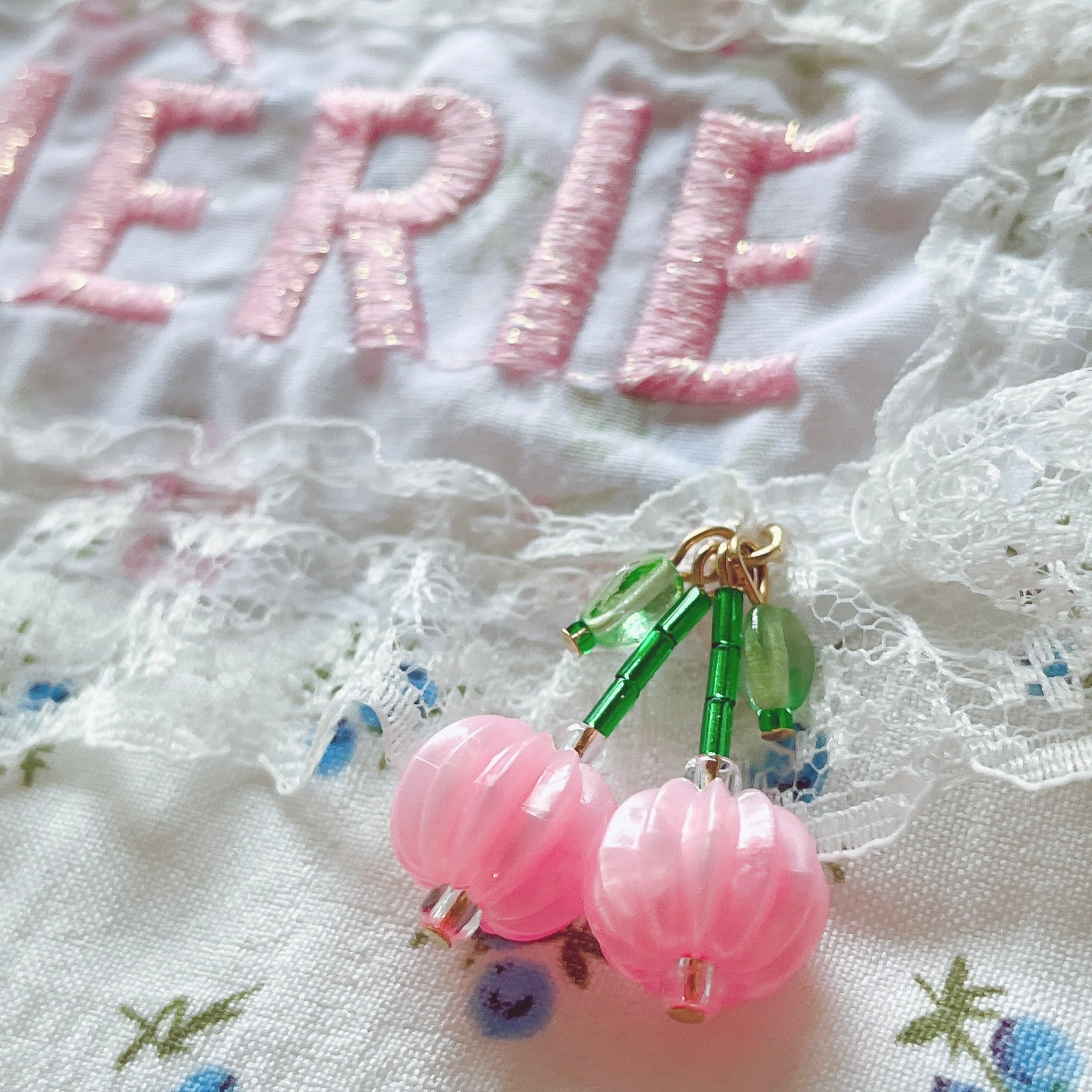 大きめのベルベットリボンとビーズで作ったチェリーもデザインのポイント。