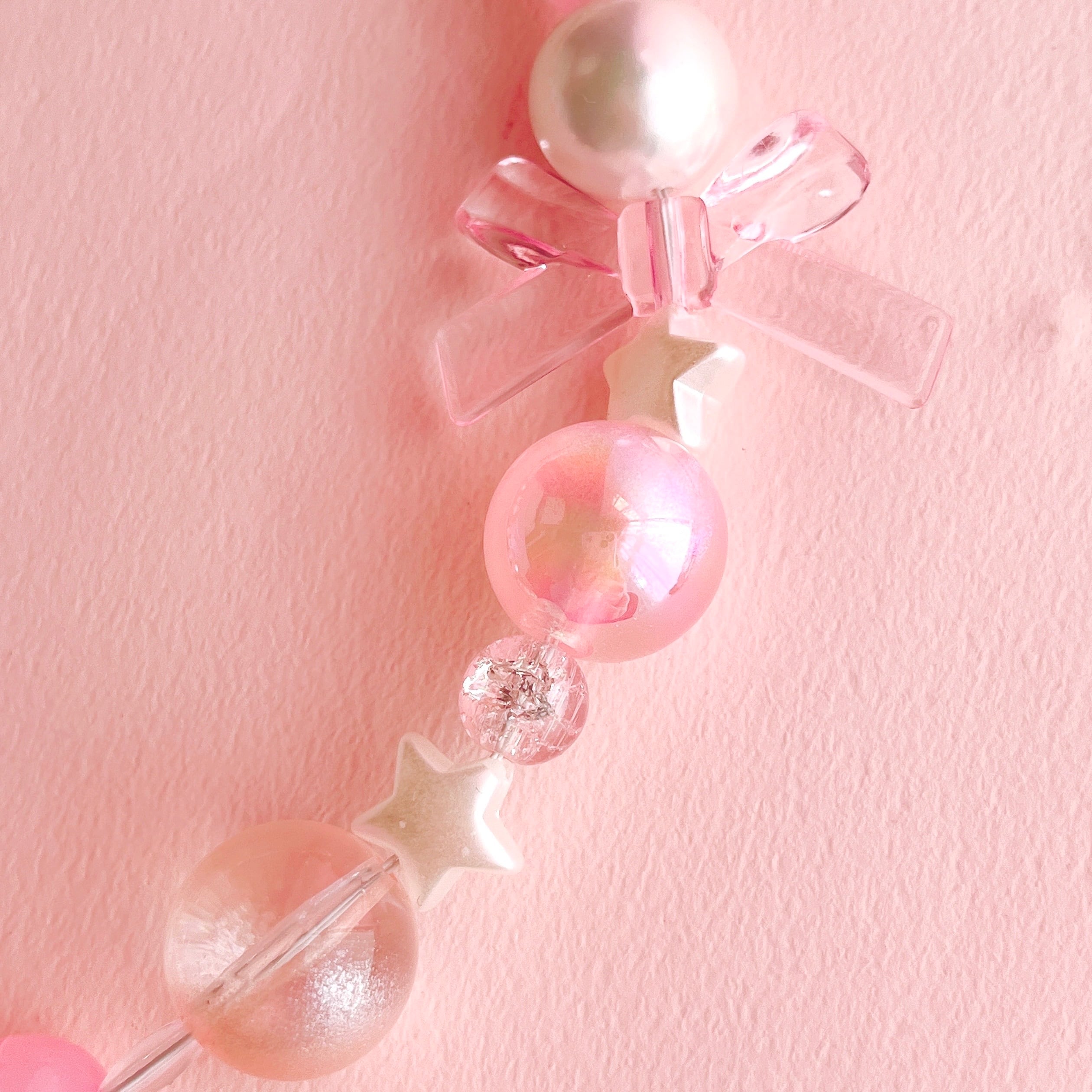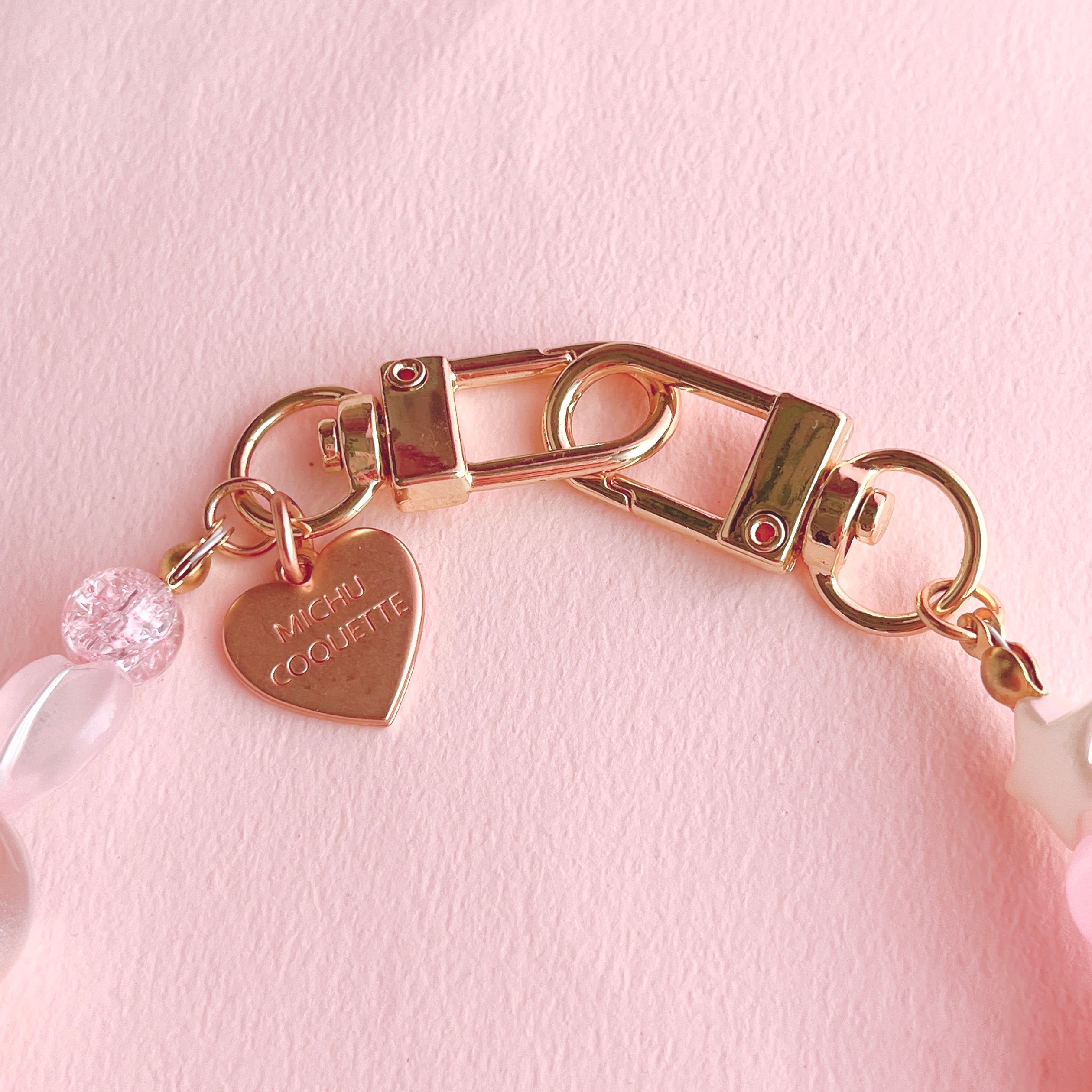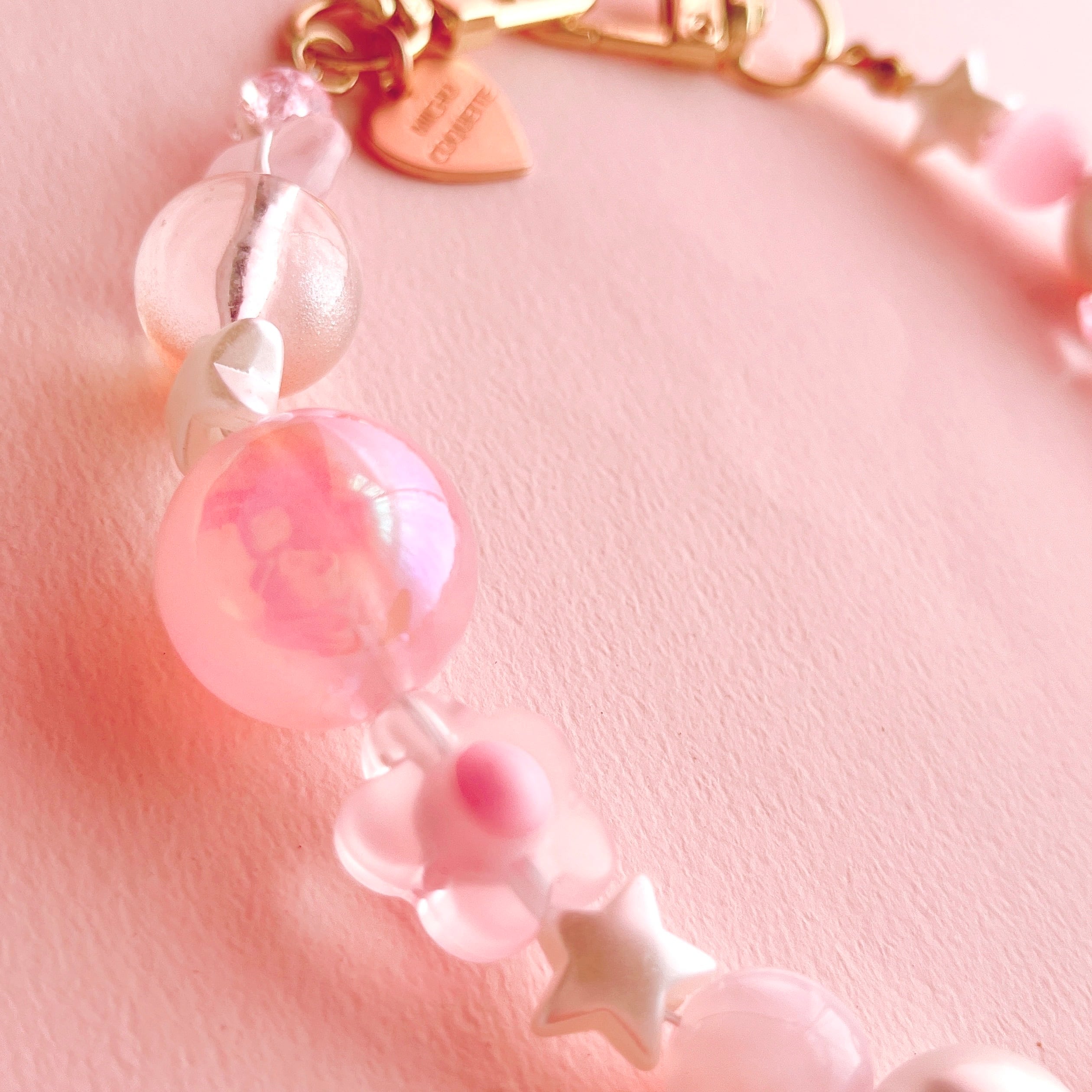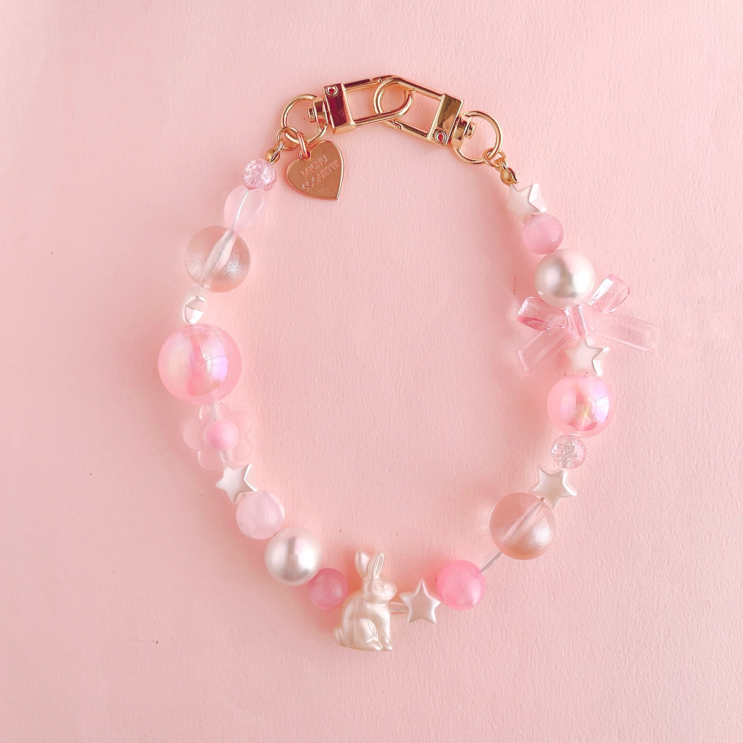 透明感のあるビーズとパールを組み合わせた、うさぎモチーフのストラップです。