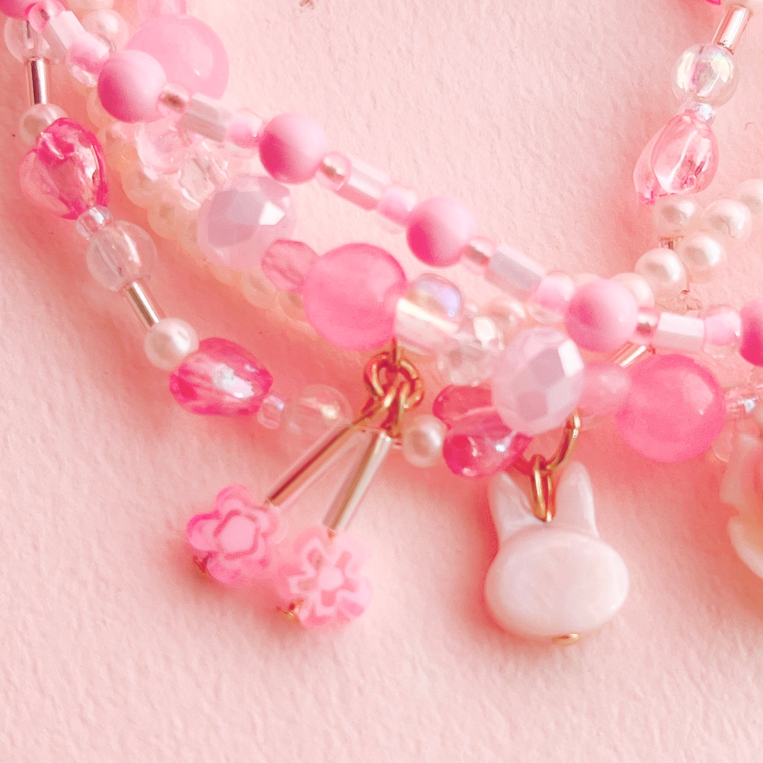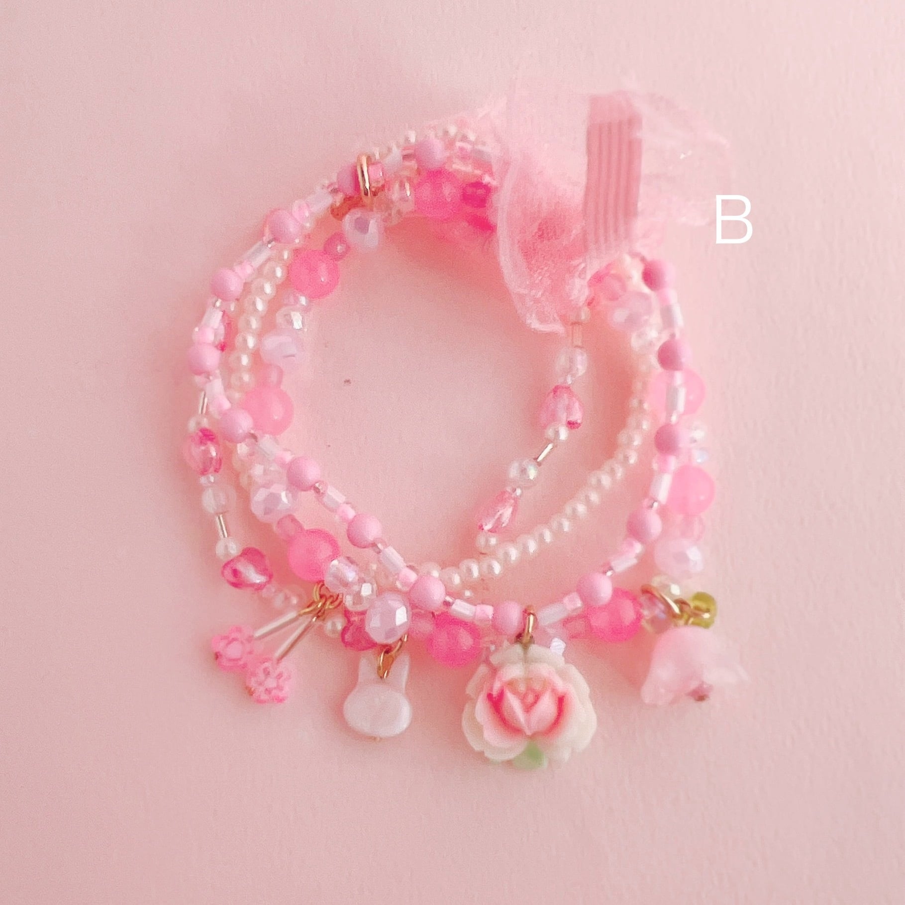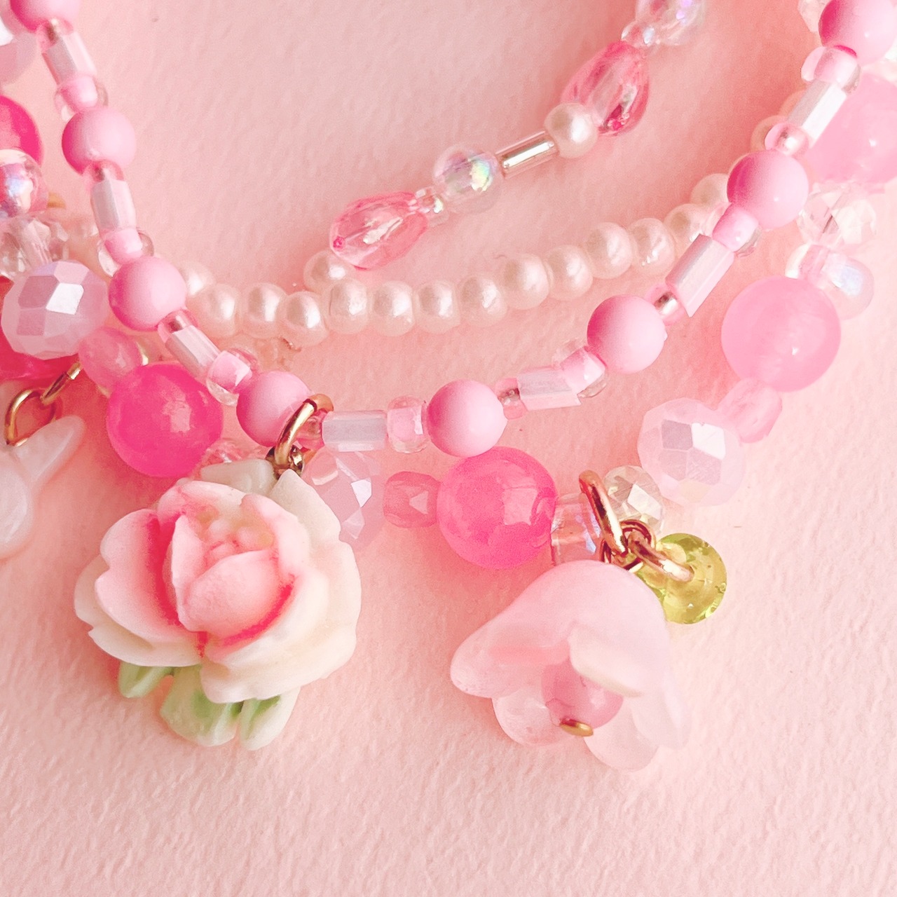 様々な素材やカラーのビーズとフラワーモチーフなどを組み合わせた、