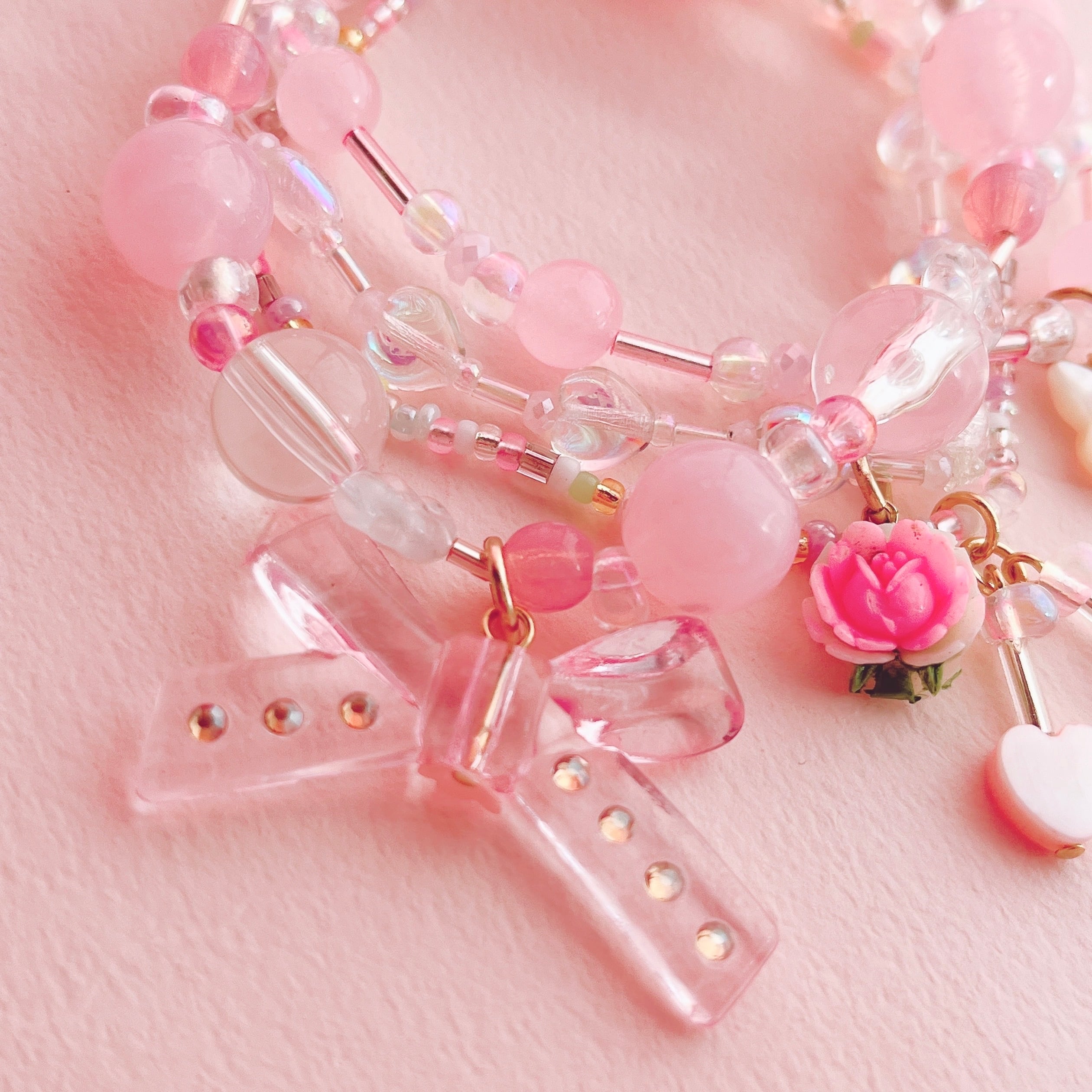 様々な素材やカラーのビーズとフラワーモチーフなどを組み合わせた、