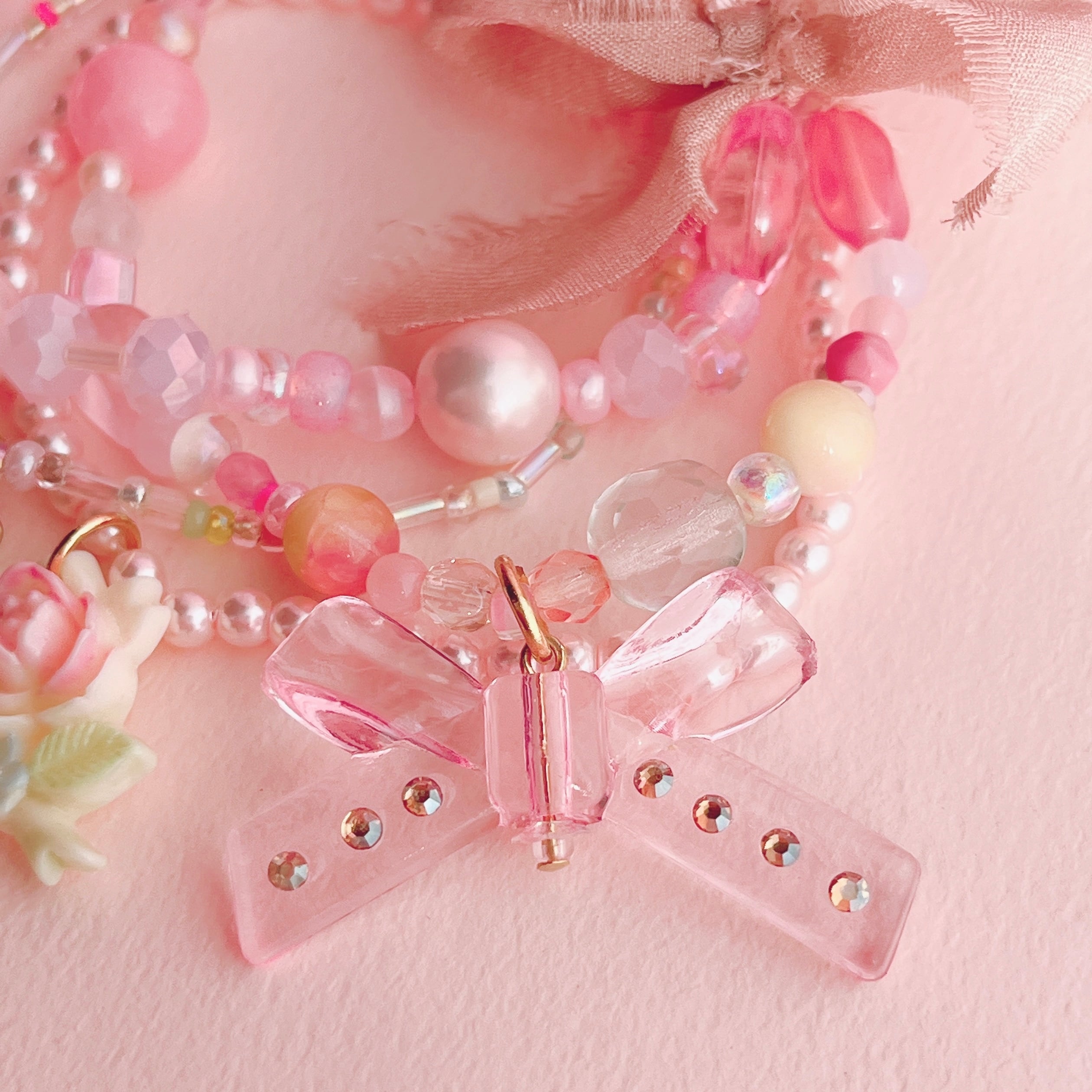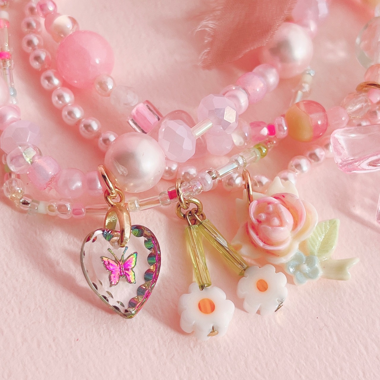 様々な素材やカラーのビーズとフラワーモチーフなどを組み合わせた、