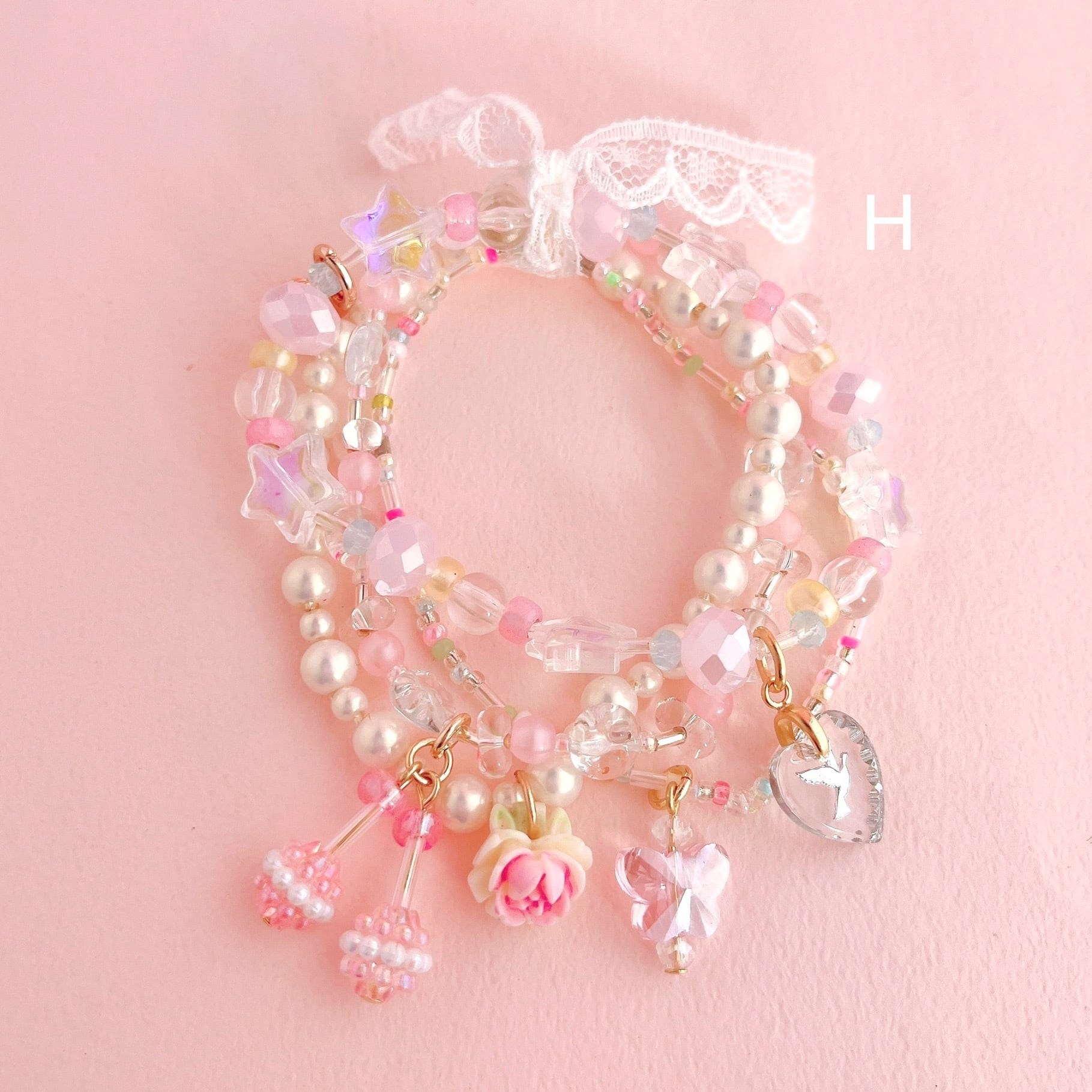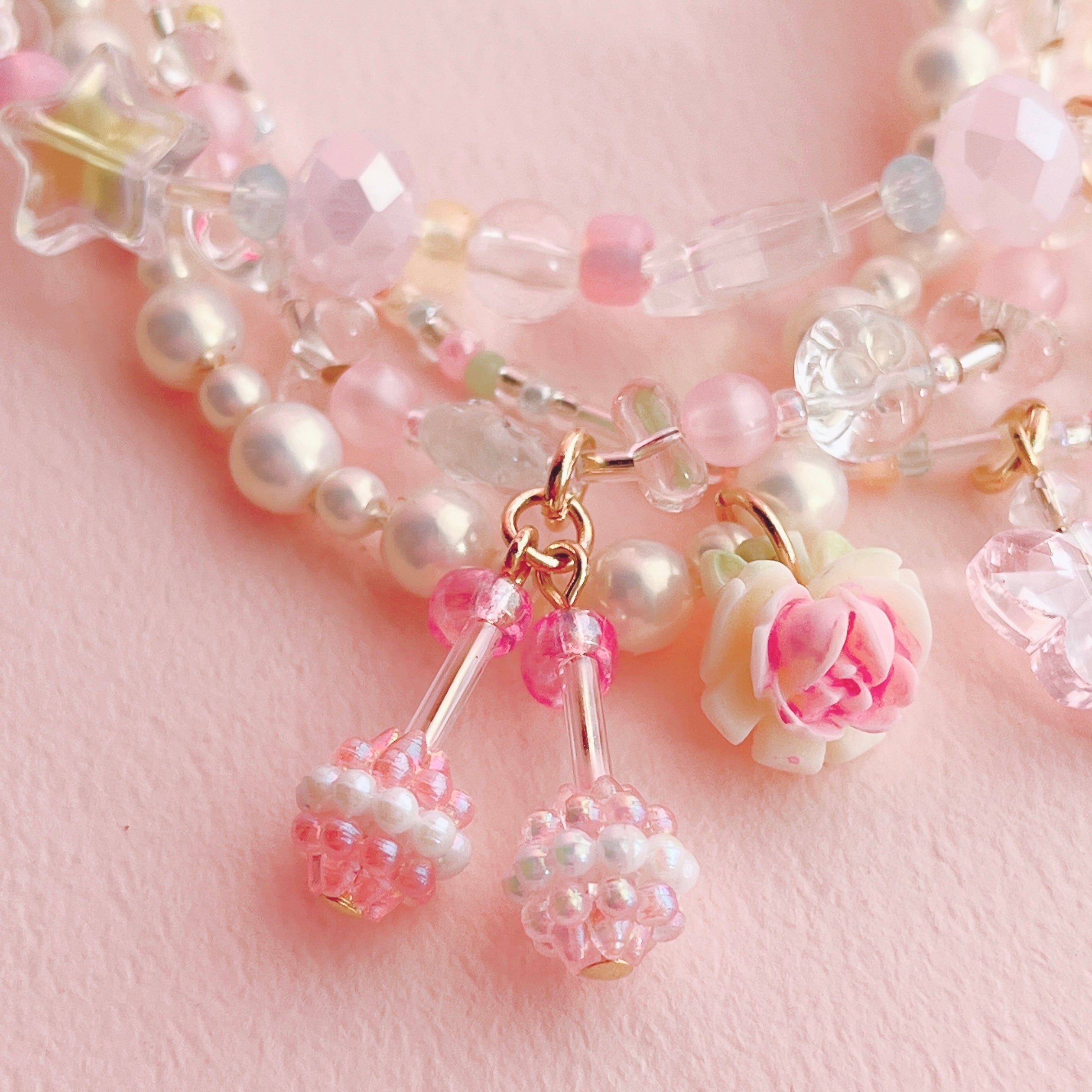 華やかでロマンティックな重ね付けブレスレットです。