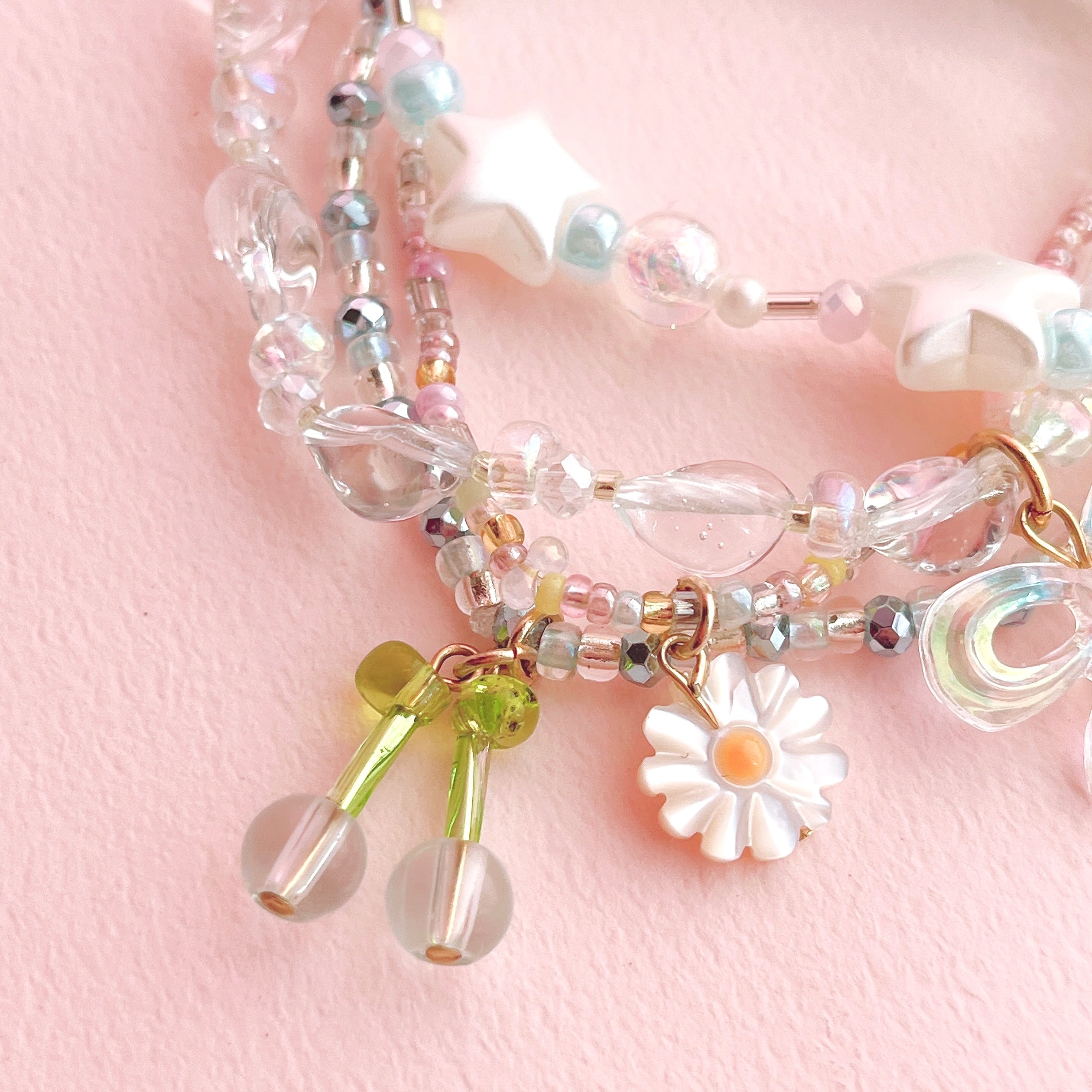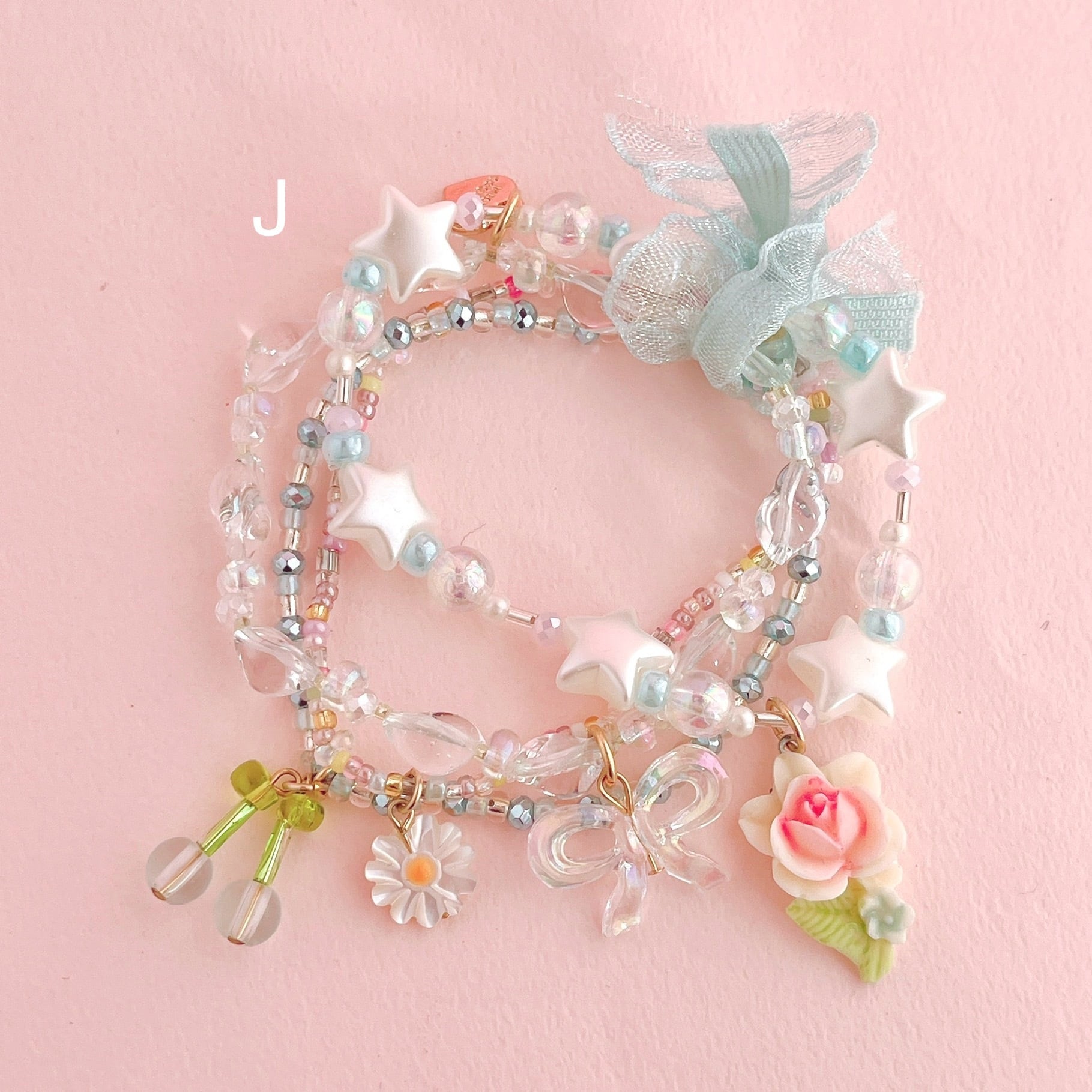 華やかでロマンティックな重ね付けブレスレットです。