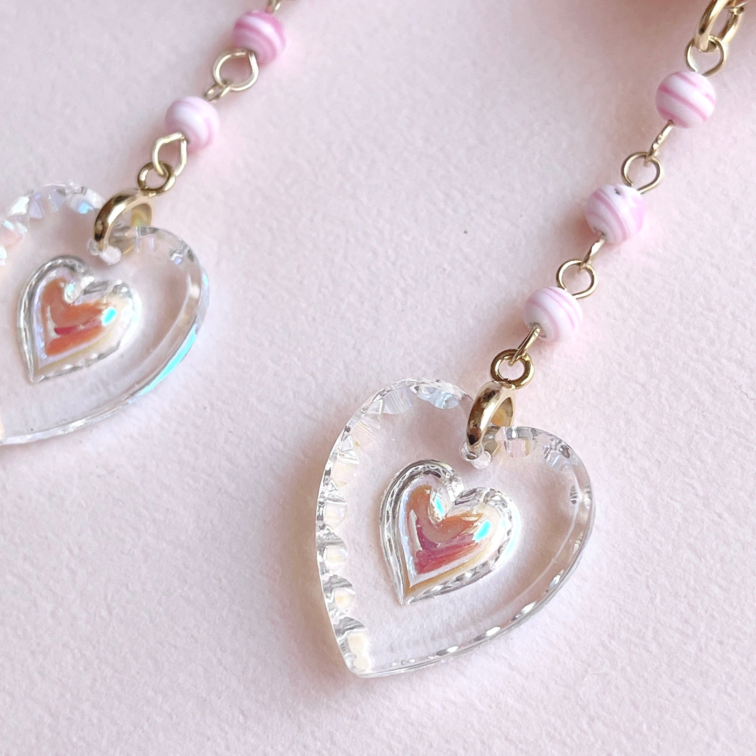 下に揺れる透明ハートチャームはガラス製。