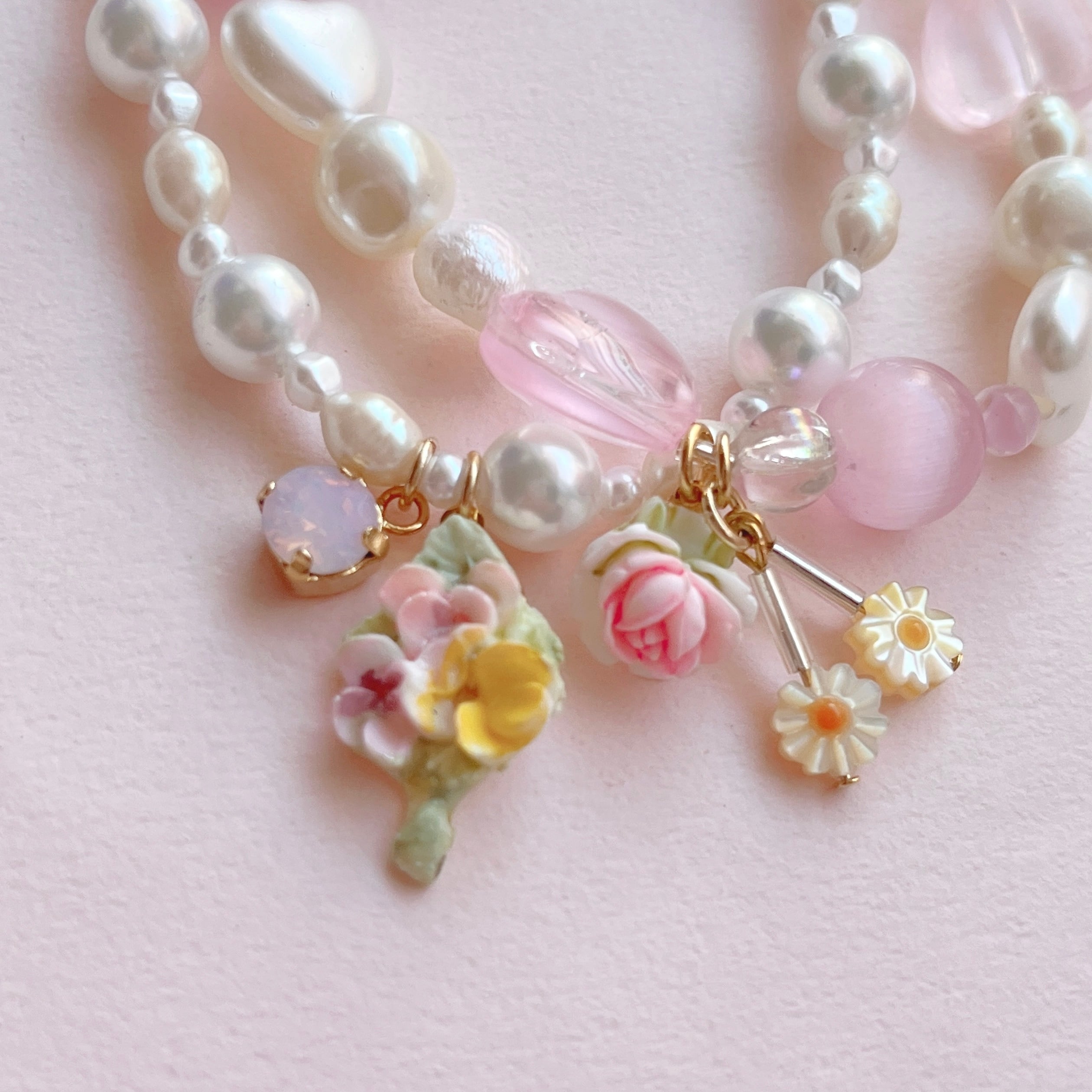 サイズや形が様々なパールや、ガラスビーズなどを組み合わせた、
