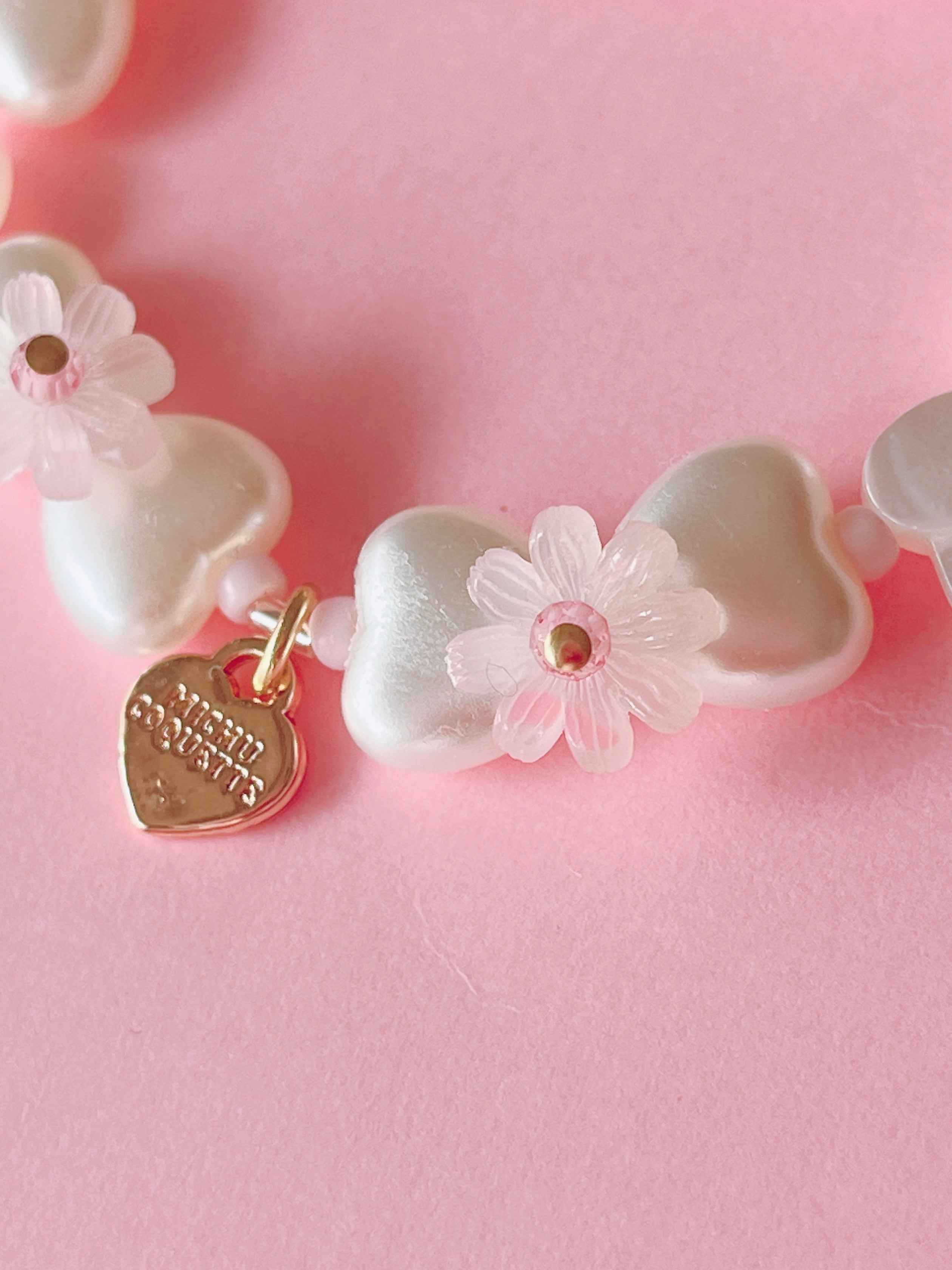 ハート型のフェイクパールはリボンのように配置し、