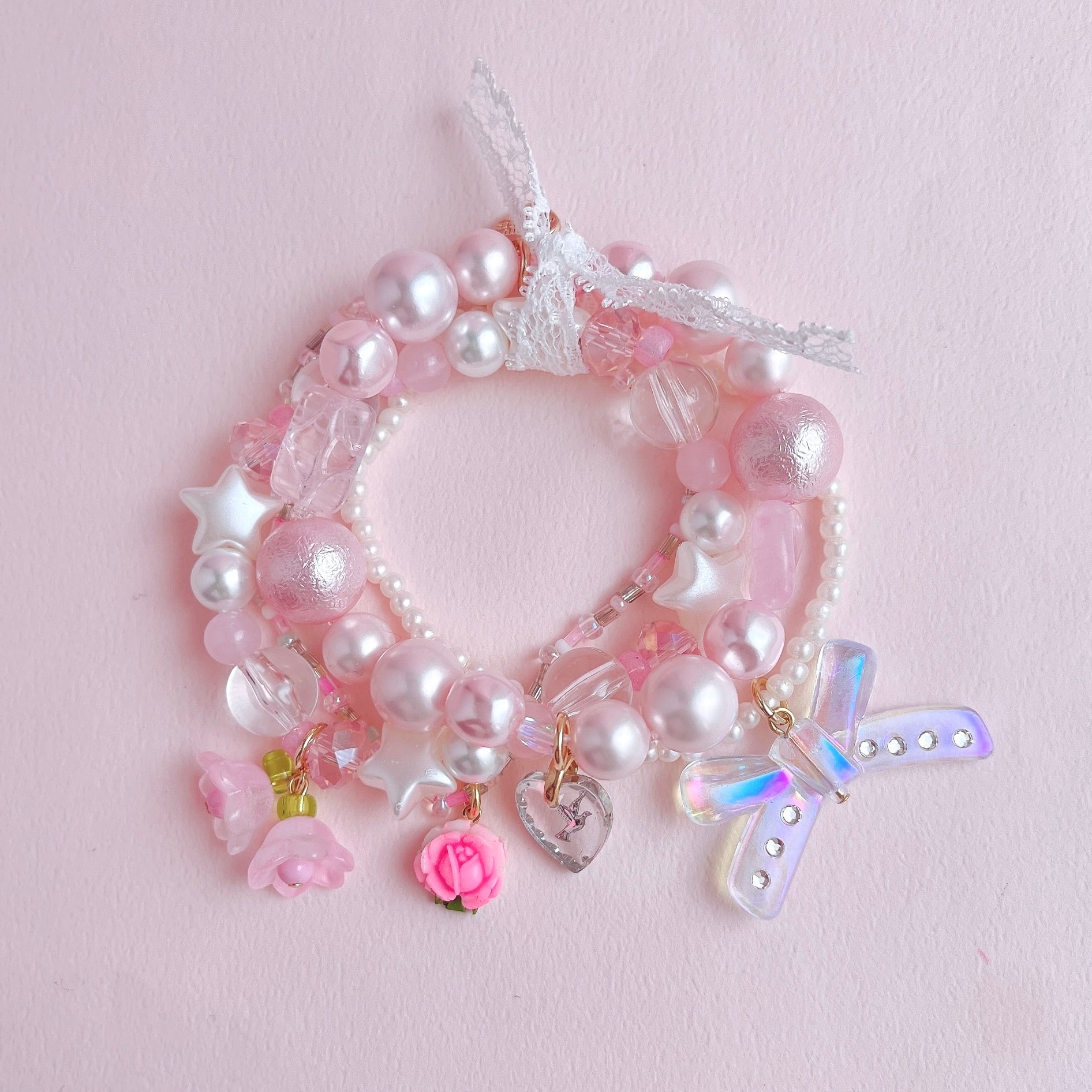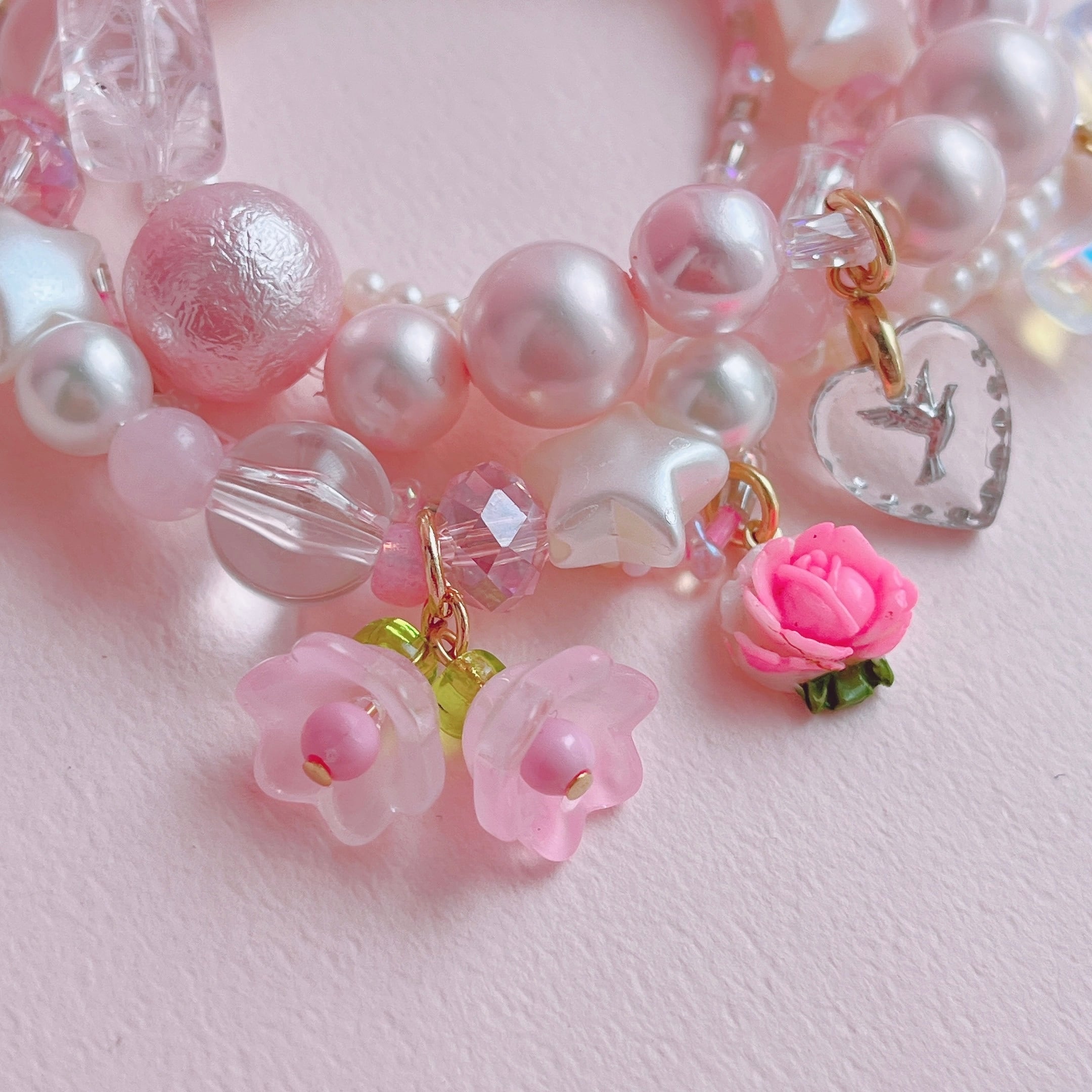 様々な素材やカラーのビーズとフラワーモチーフなどを組み合わせた、
