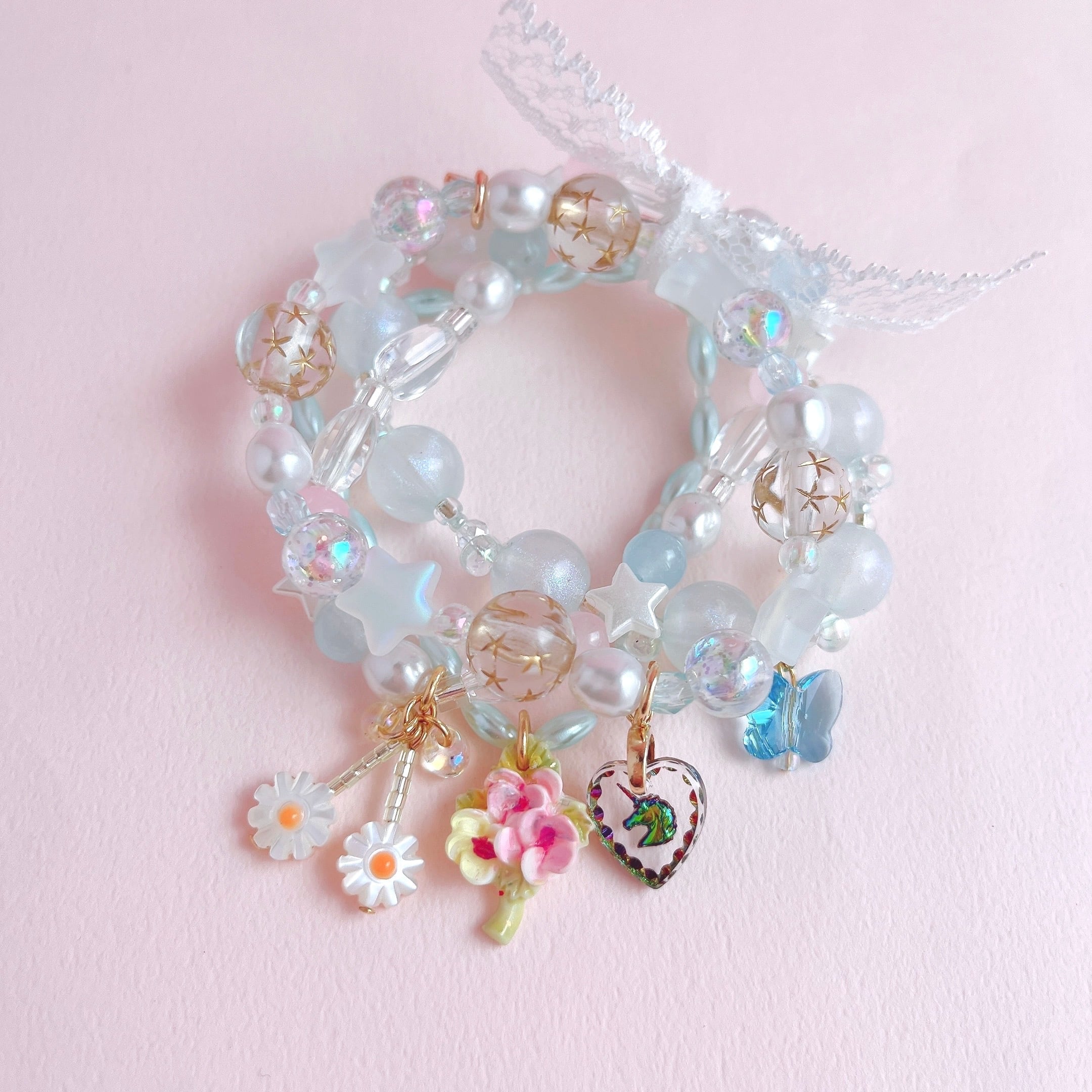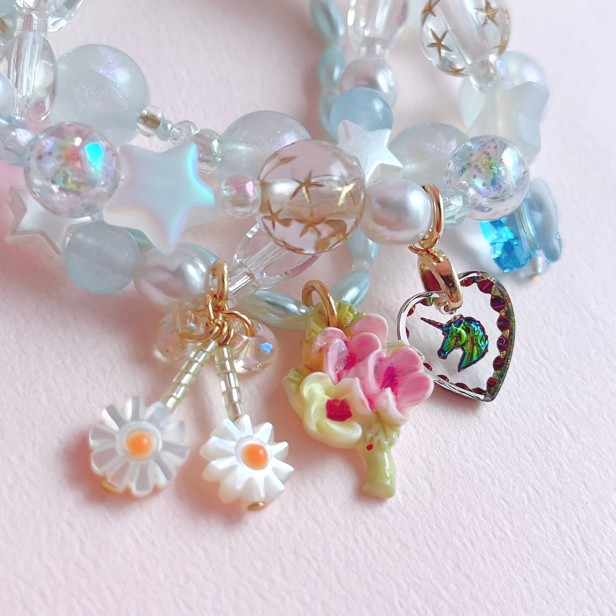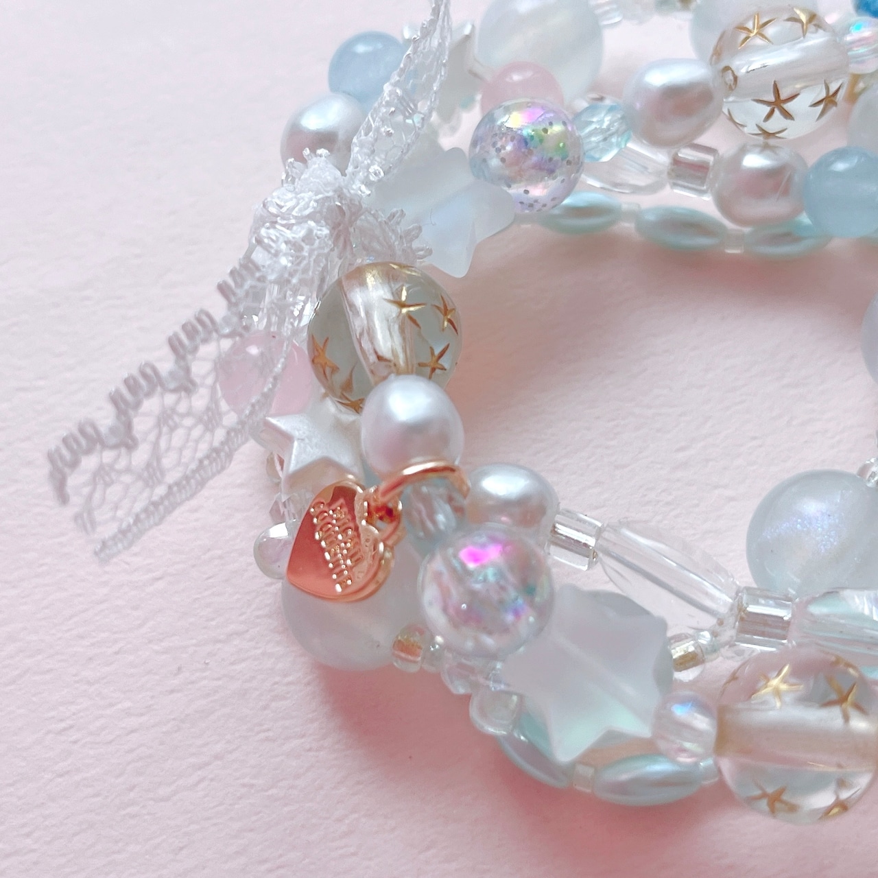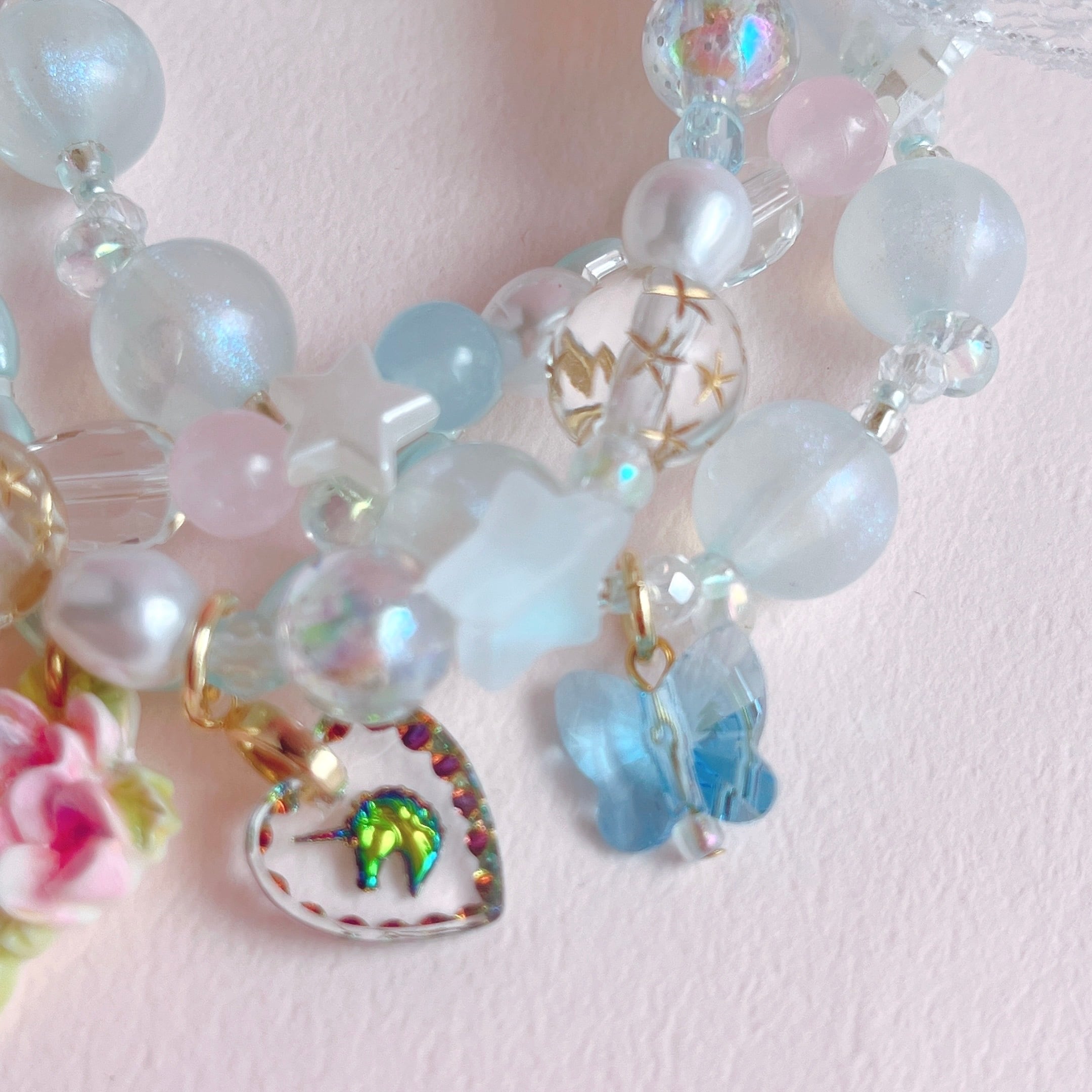華やかでロマンティックな重ね付けブレスレットです。