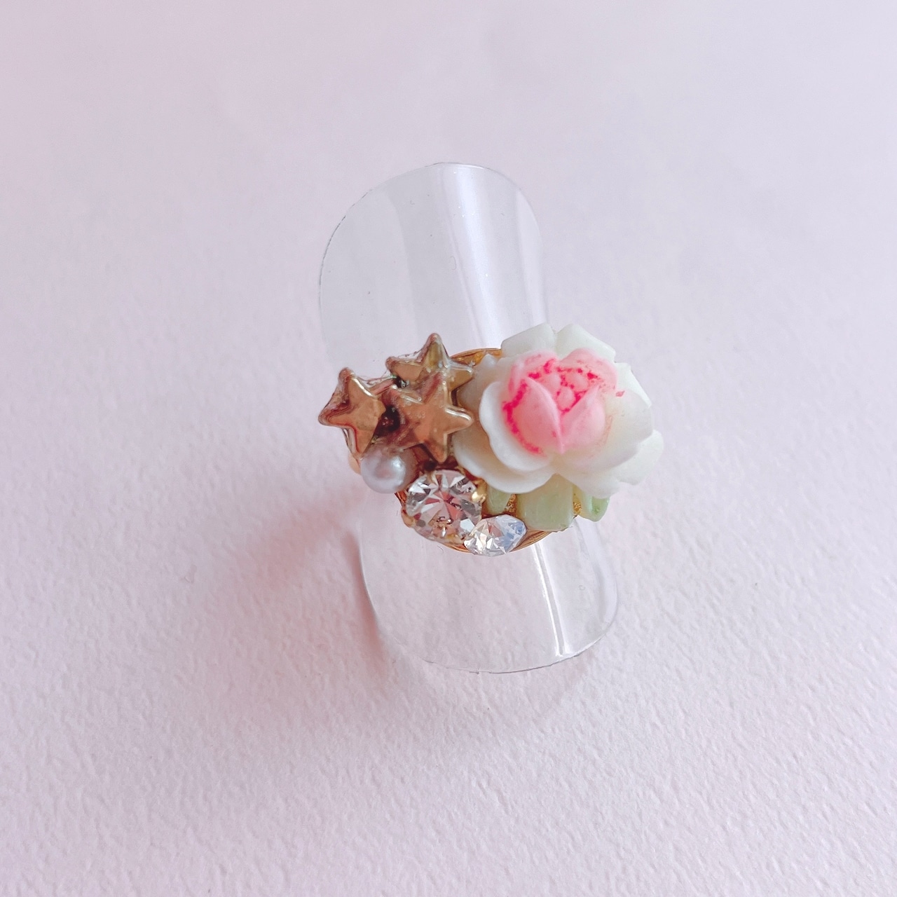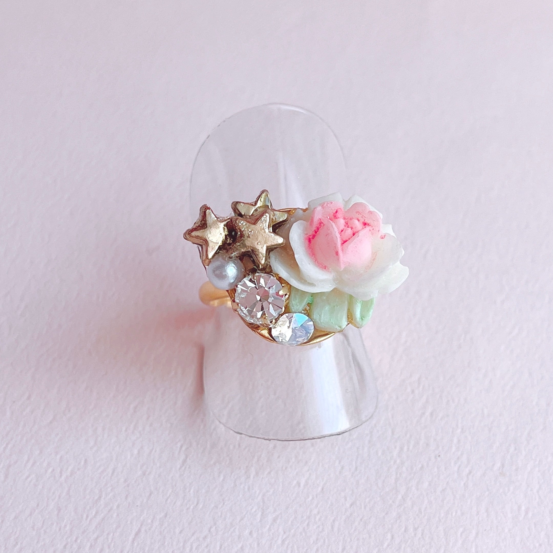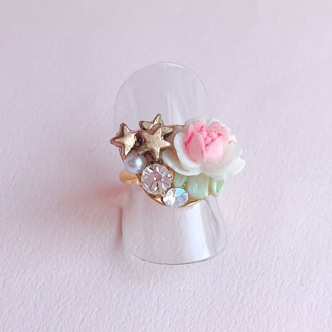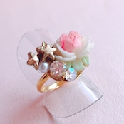 ローズを中心に、クリスタルビジューと小さなフェイクパールや星のパーツを組み合わせた、ロマンティックなリングです。