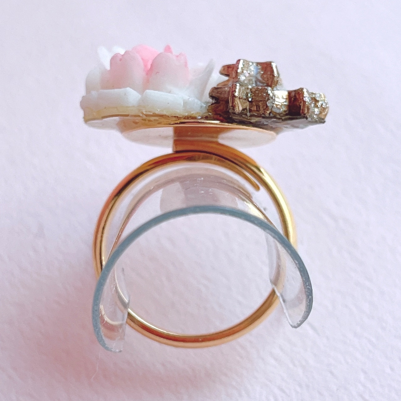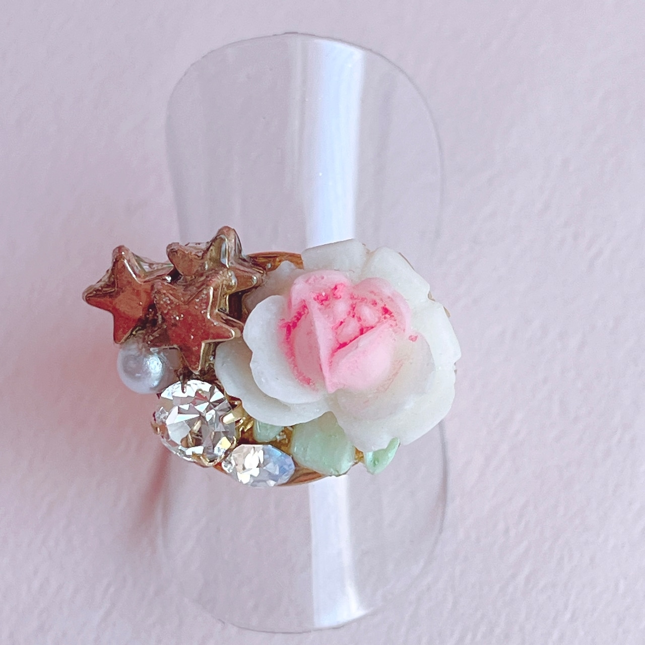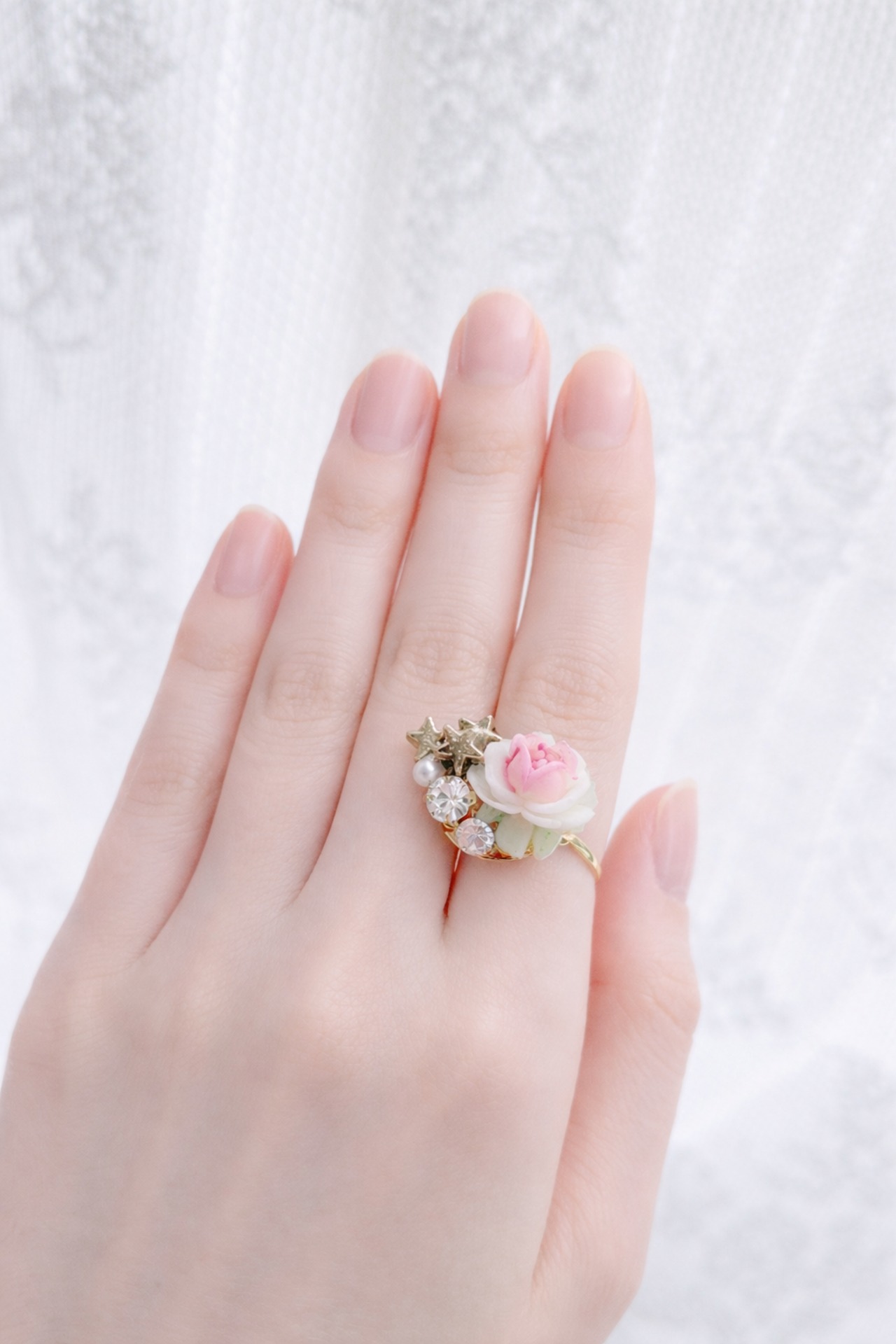 ローズを中心に、クリスタルビジューと小さなフェイクパールや星のパーツを組み合わせた、ロマンティックなリングです。