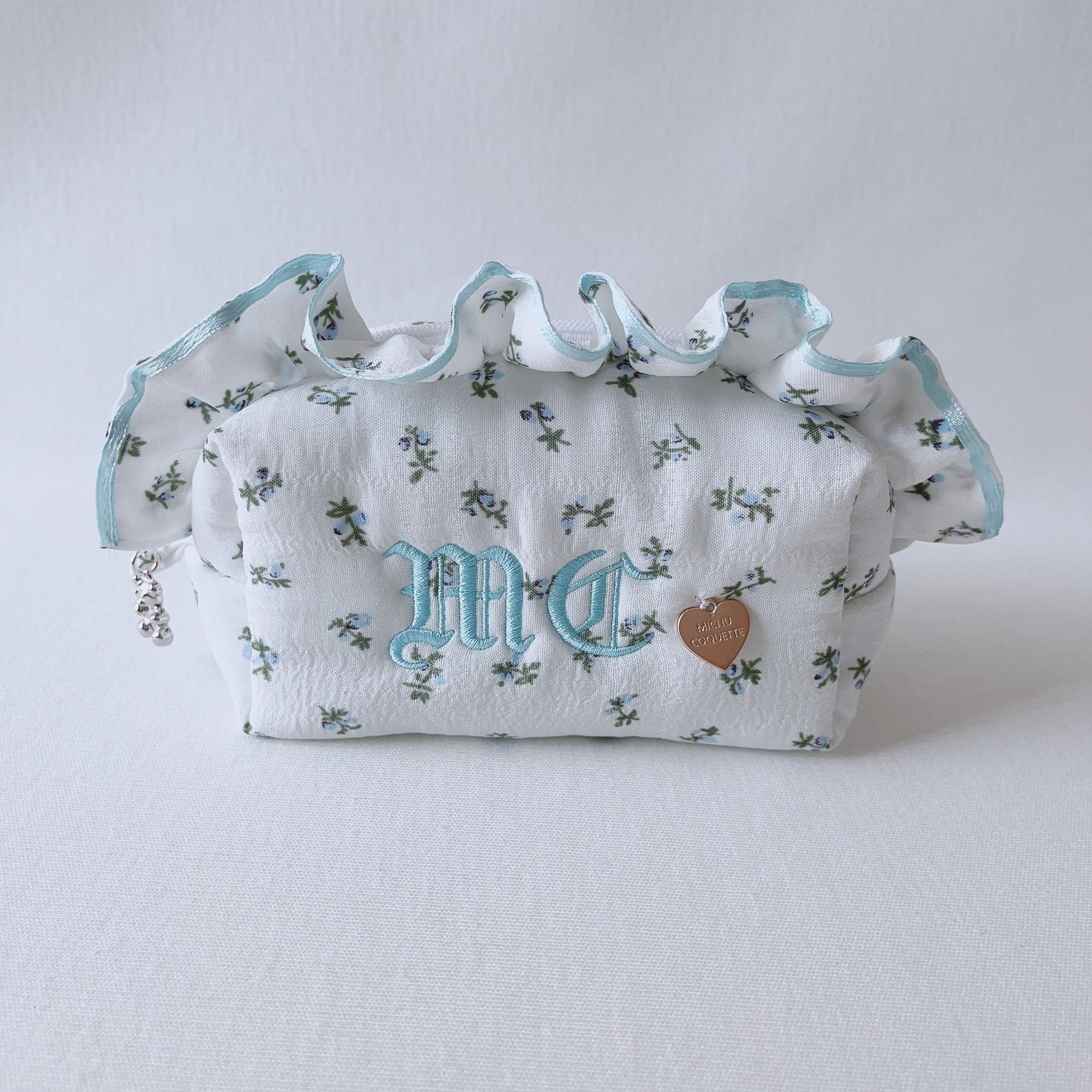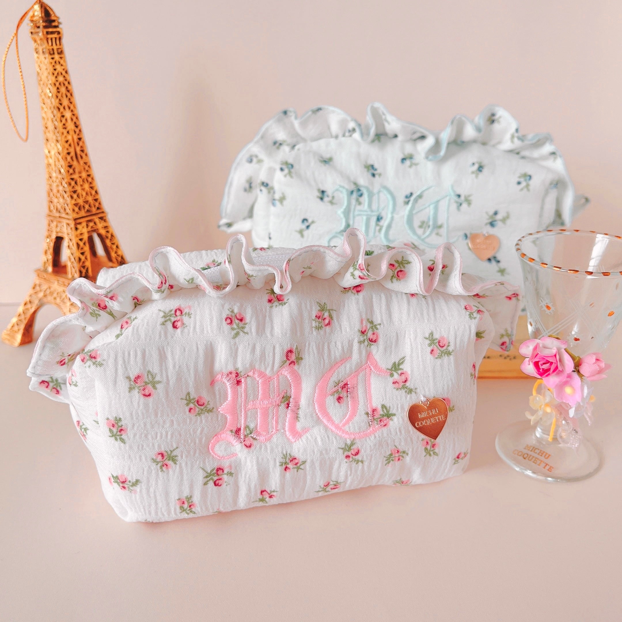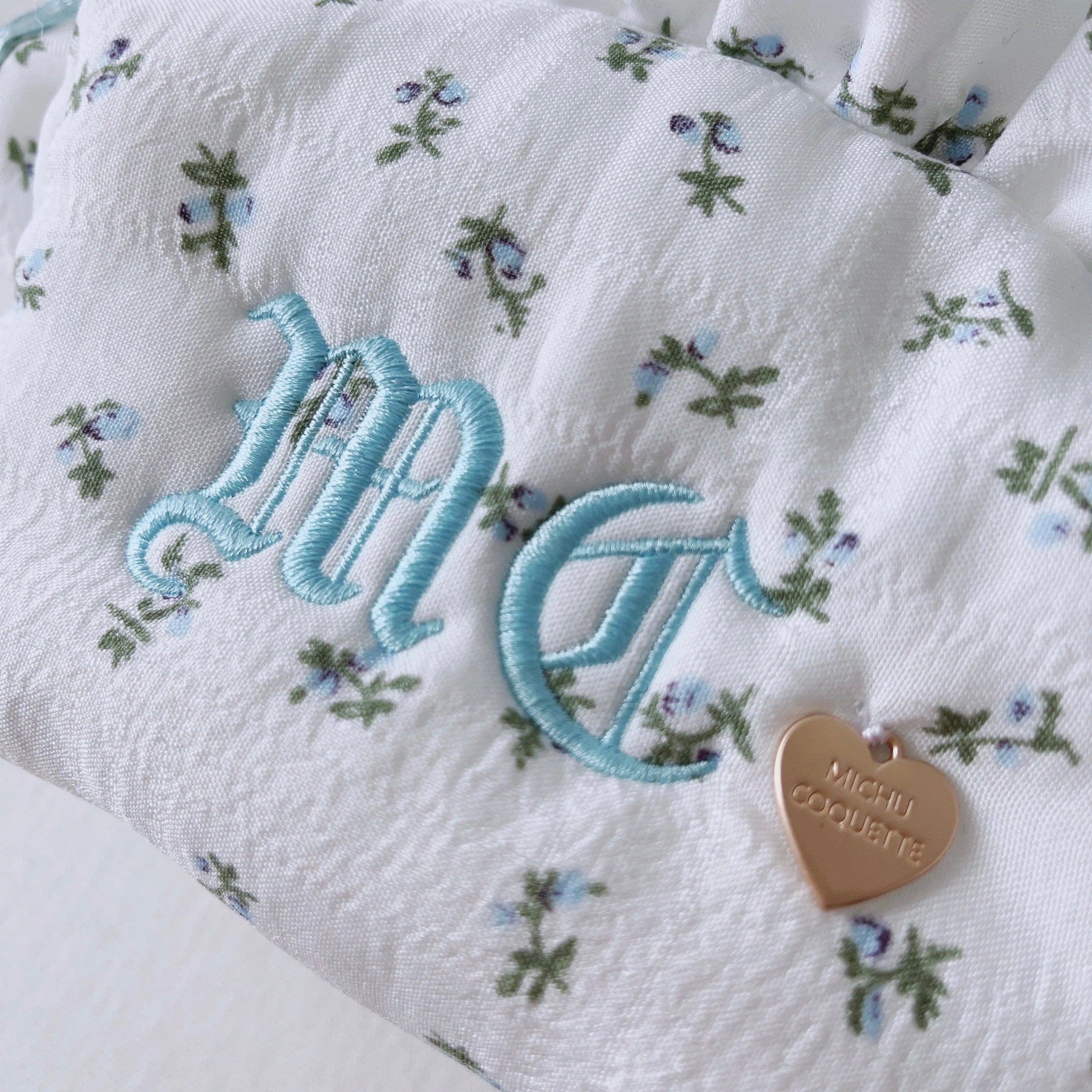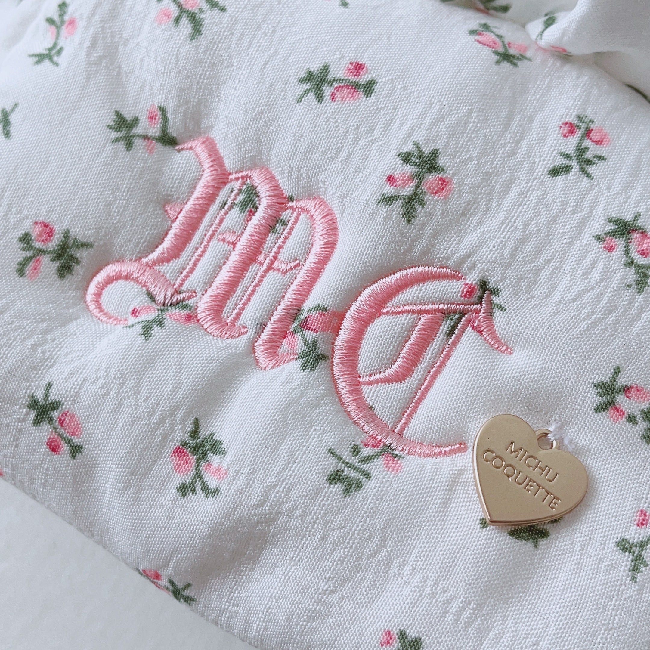 ●MICHU COQUETTEのイニシャル「M C」を刺繍した小花柄のポーチ